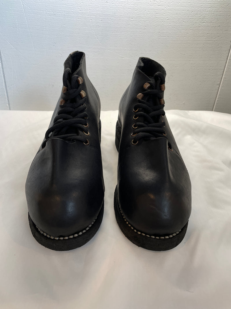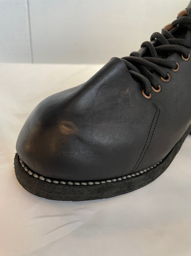 古き良きワークブーツを思わせる佇まいと、相反するエッジの立ったデザイン性が共存した非常にユニークなキャラクター性を持ったアイテム。