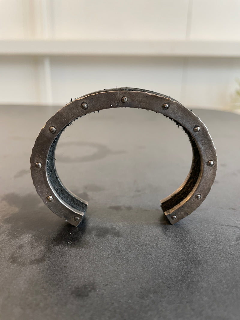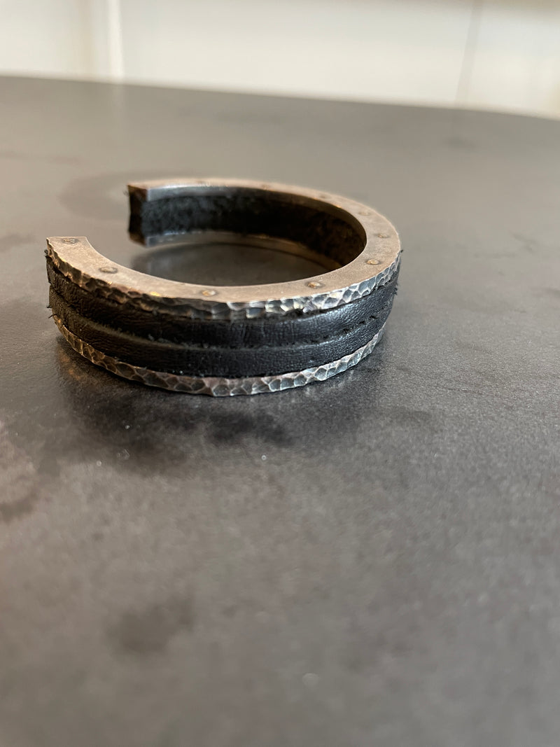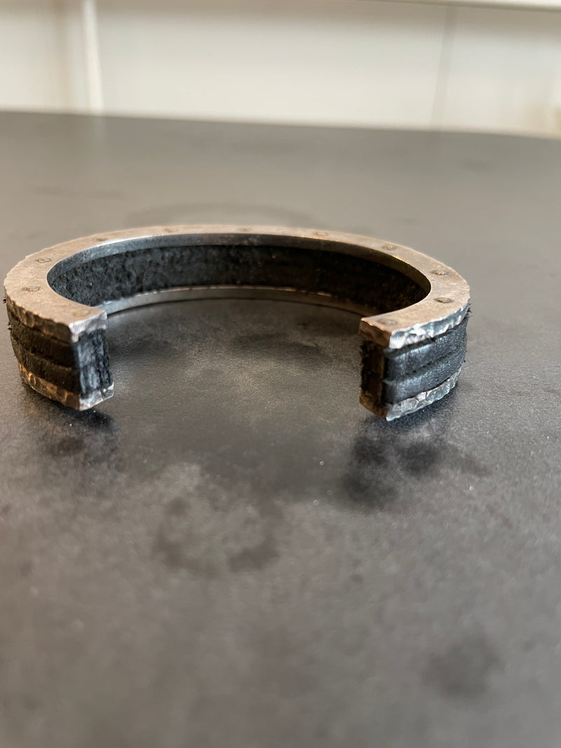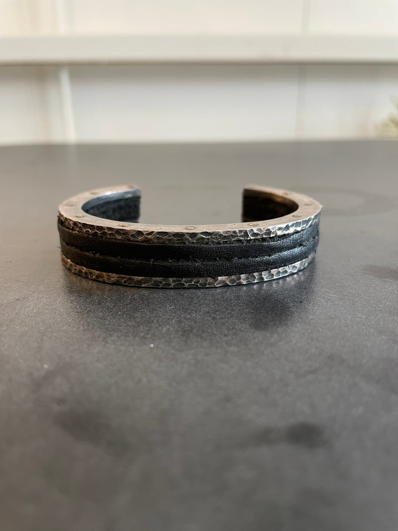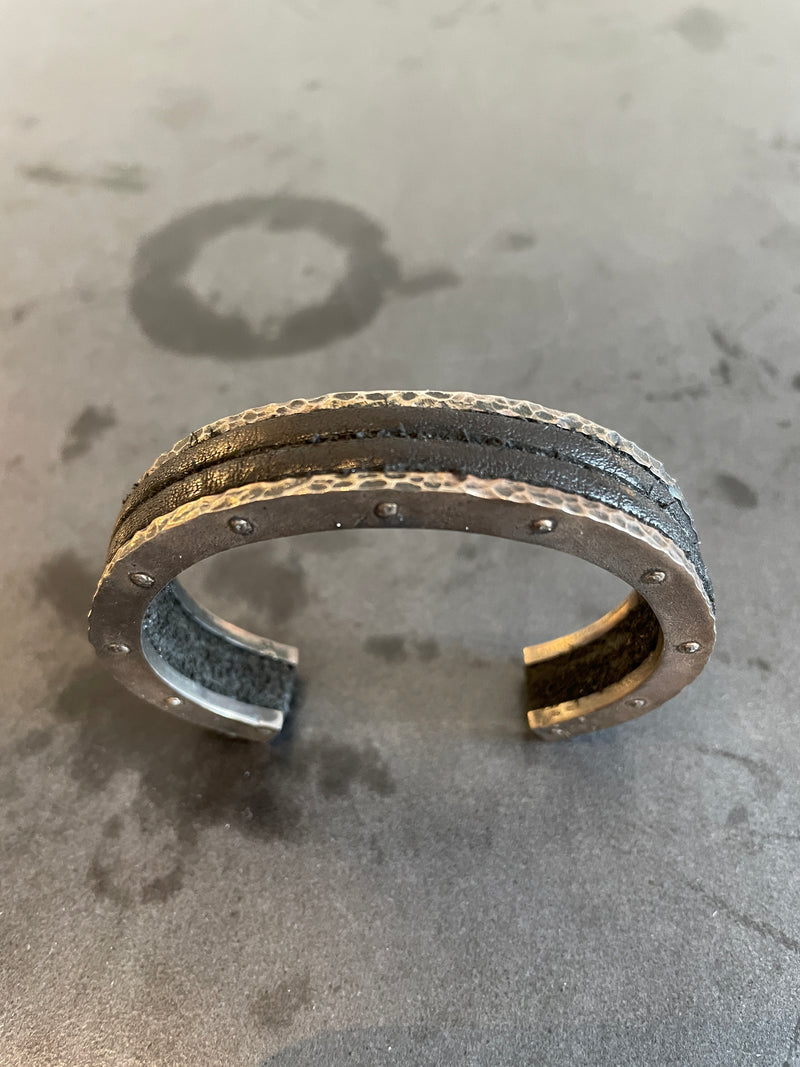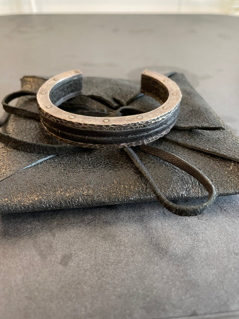燻をかけ槌目加工を施したシルバーパーツでレザーを上下から挟み込んだデザインのバングル。