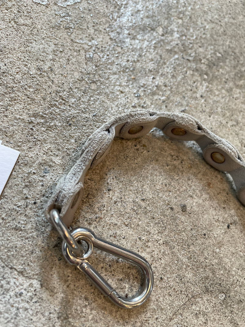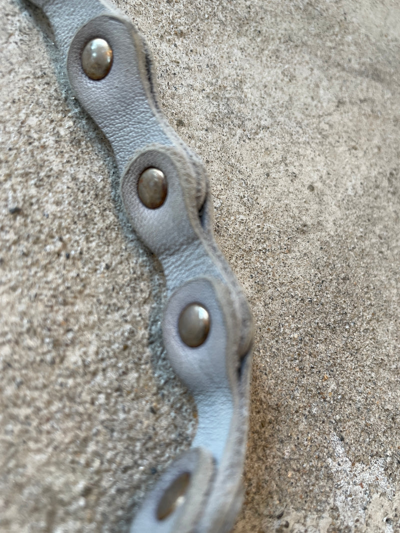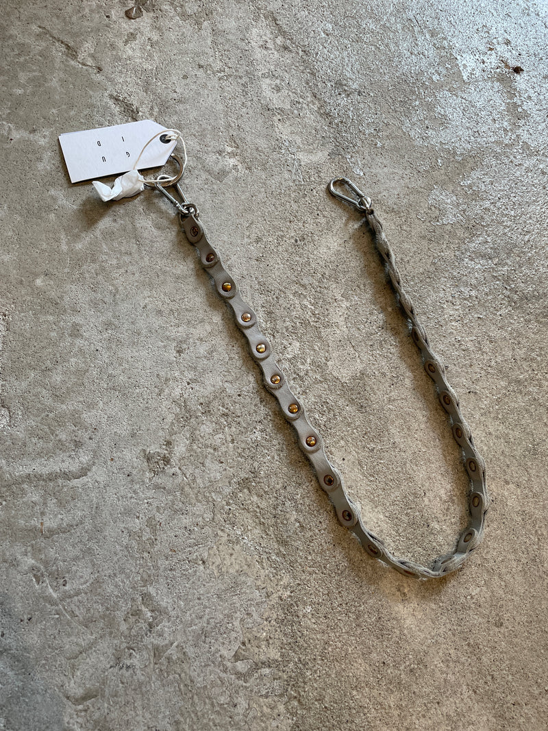 規則的に連続するレザーのモチーフを、アンティーク加工を施した金具パーツによって連結させたシーズナルデザイン。
