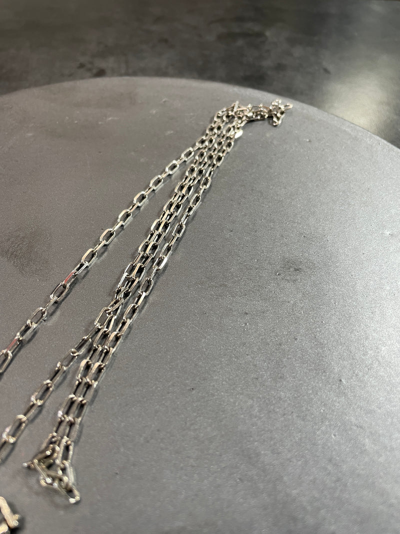 全長約75cmの隙間のある構造のチェーンは、存在感を有しながら着用感はあくまでもライト、日常的な使用を想定したデザインとなっている。