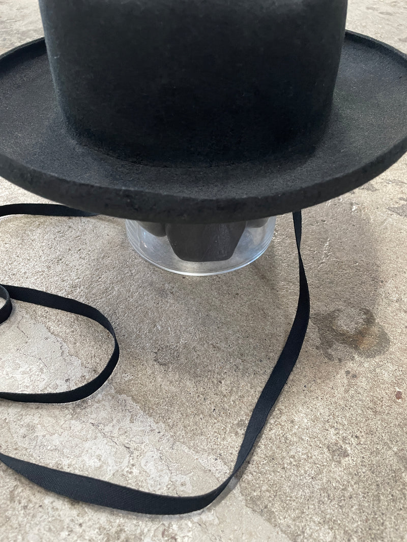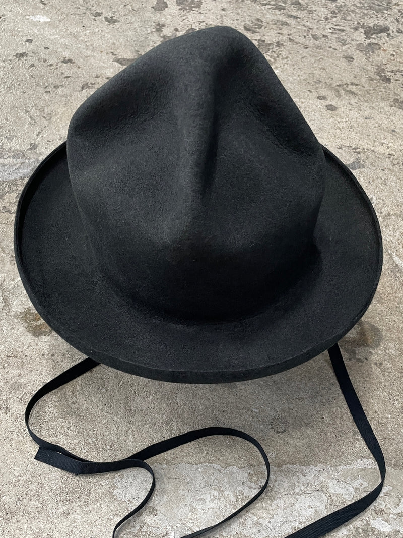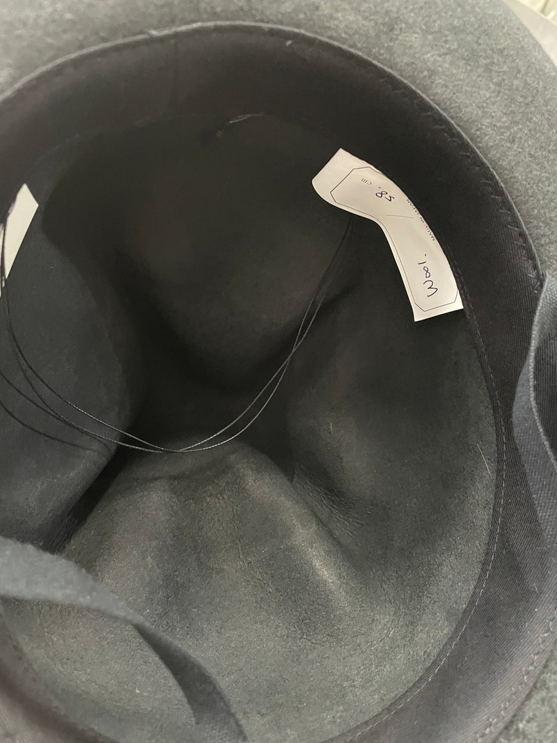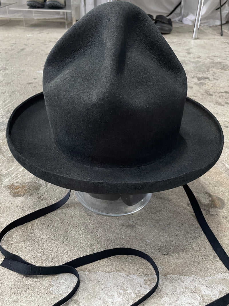 ハットメイキングにおいて必須と言える工程である「ノリ付け」の段階で、染料を混ぜたノリを塗布、汚しともダメージとも異なる、独自の表情を生み出している。