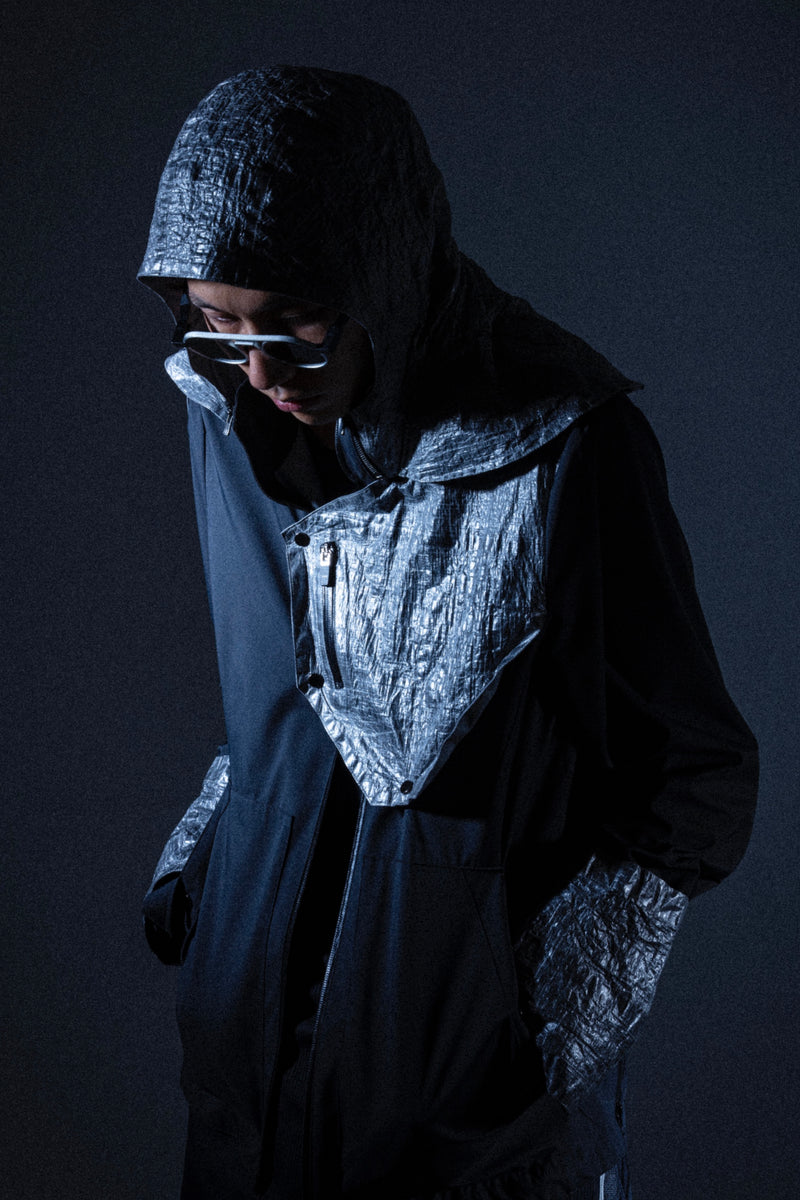 経年により深く刻まれるシュリンクの表情が、繊維の持つ機能/革新性とのギャップを生み出し、最先端素材ならではのフューチャリスティックな佇まいと機能、そして相反する特別な表情を製品に付加する。