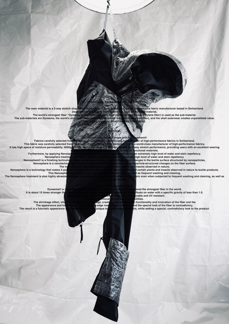 スイスに拠点を構える高機能生地メーカー、「Schoeller®︎」(シェラー/ショーラー)社の2way stretch shape with Nanosphere®︎をメインマテリアルに、世界最強の繊維「Dyneema®︎」(ダイニーマ®︎=超高分子量ポリエチレン繊維)をサブマテリアルにそれぞれ採用し、比類なき価値を創造したシェルアウター。