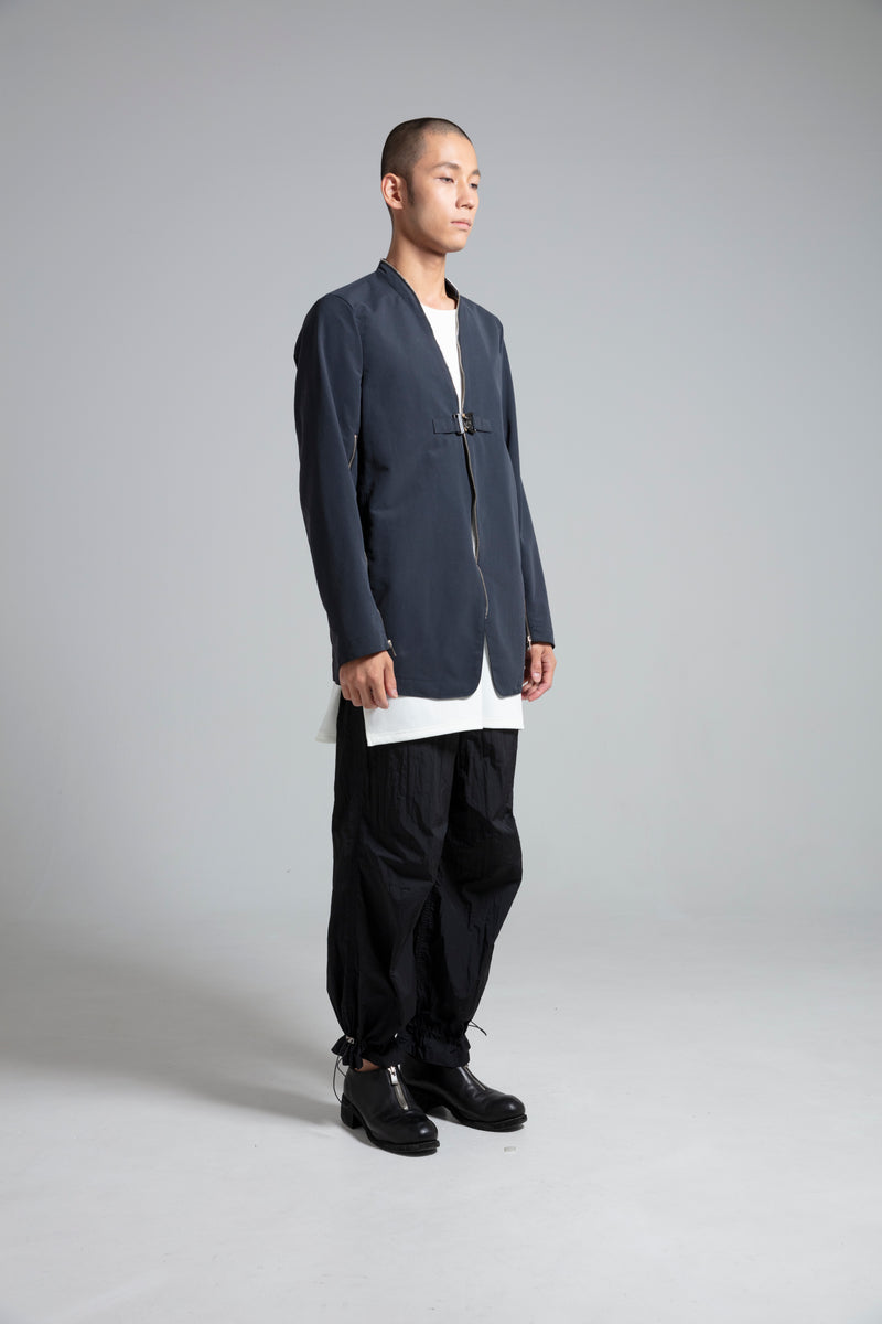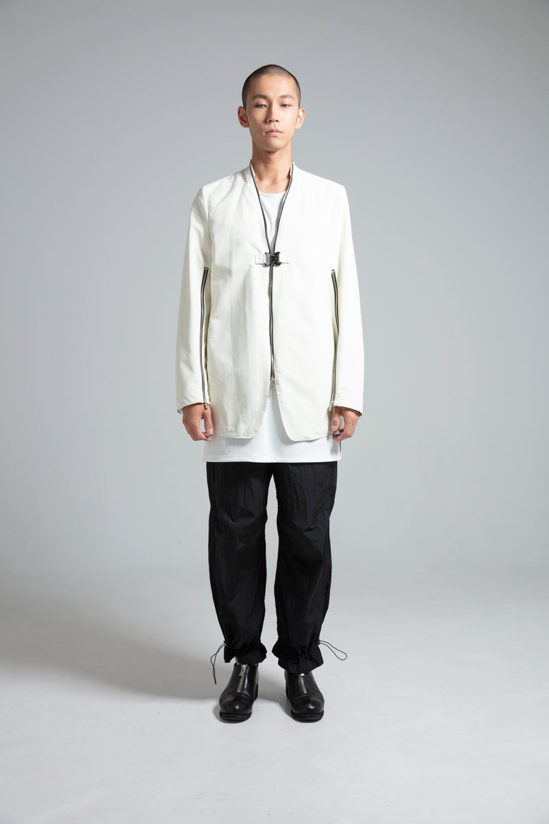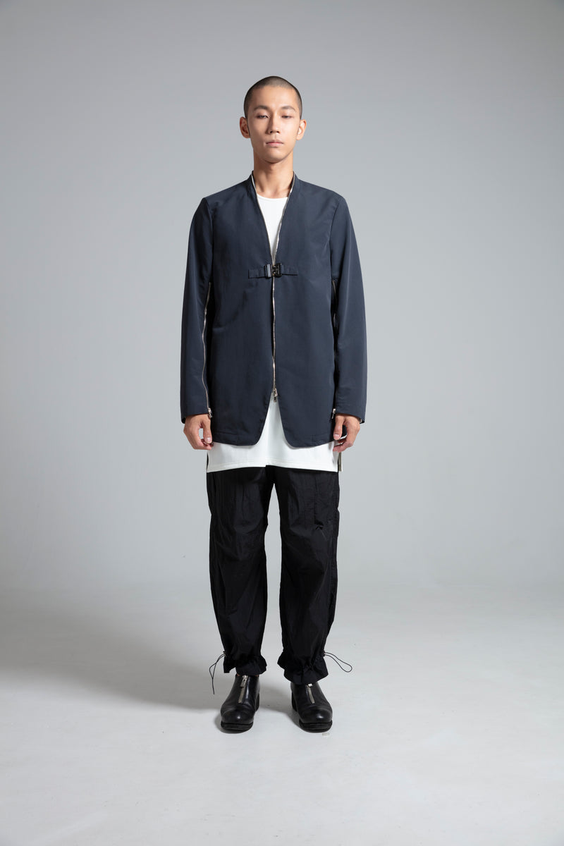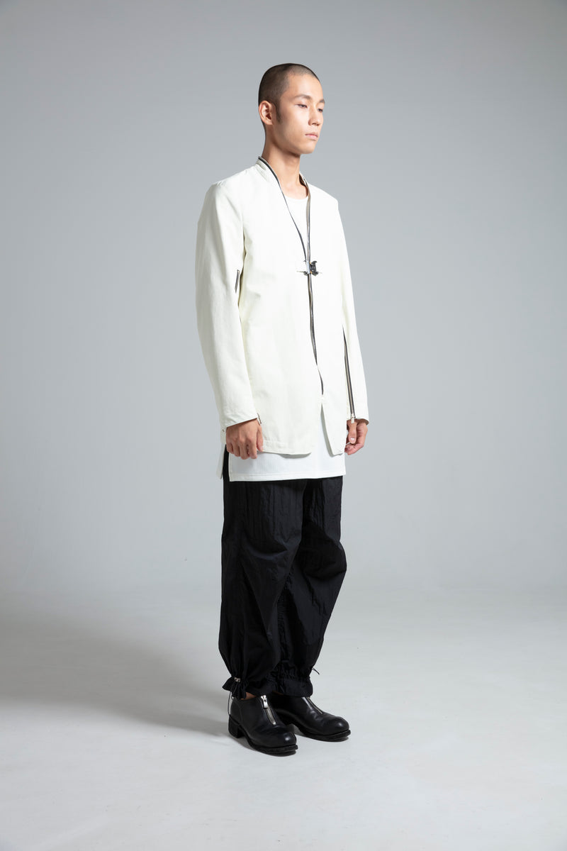YKK EXCELLAを採用したフロントファスナーをセンターバックまで一周するように配置、高輝度なジップラインがまずこの品番の佇まいを印象付けるポイント。