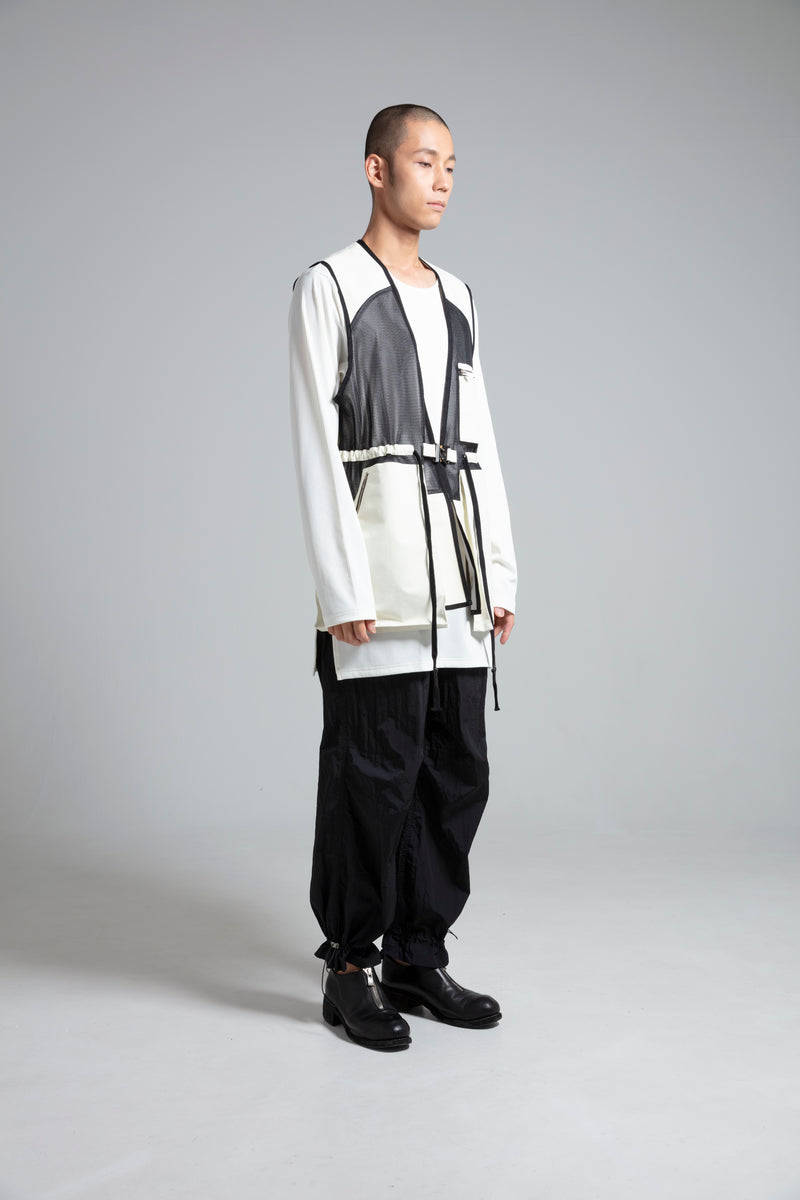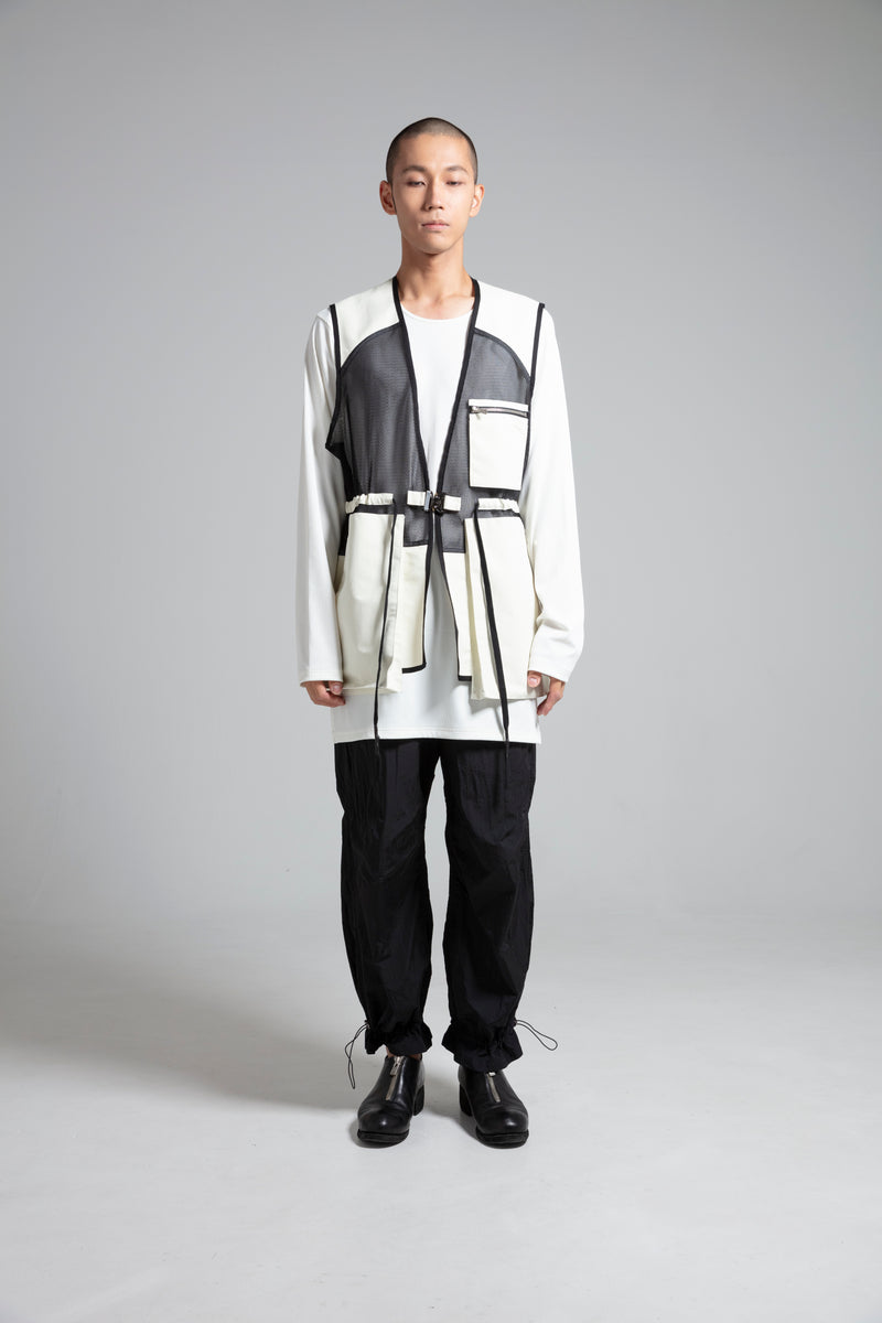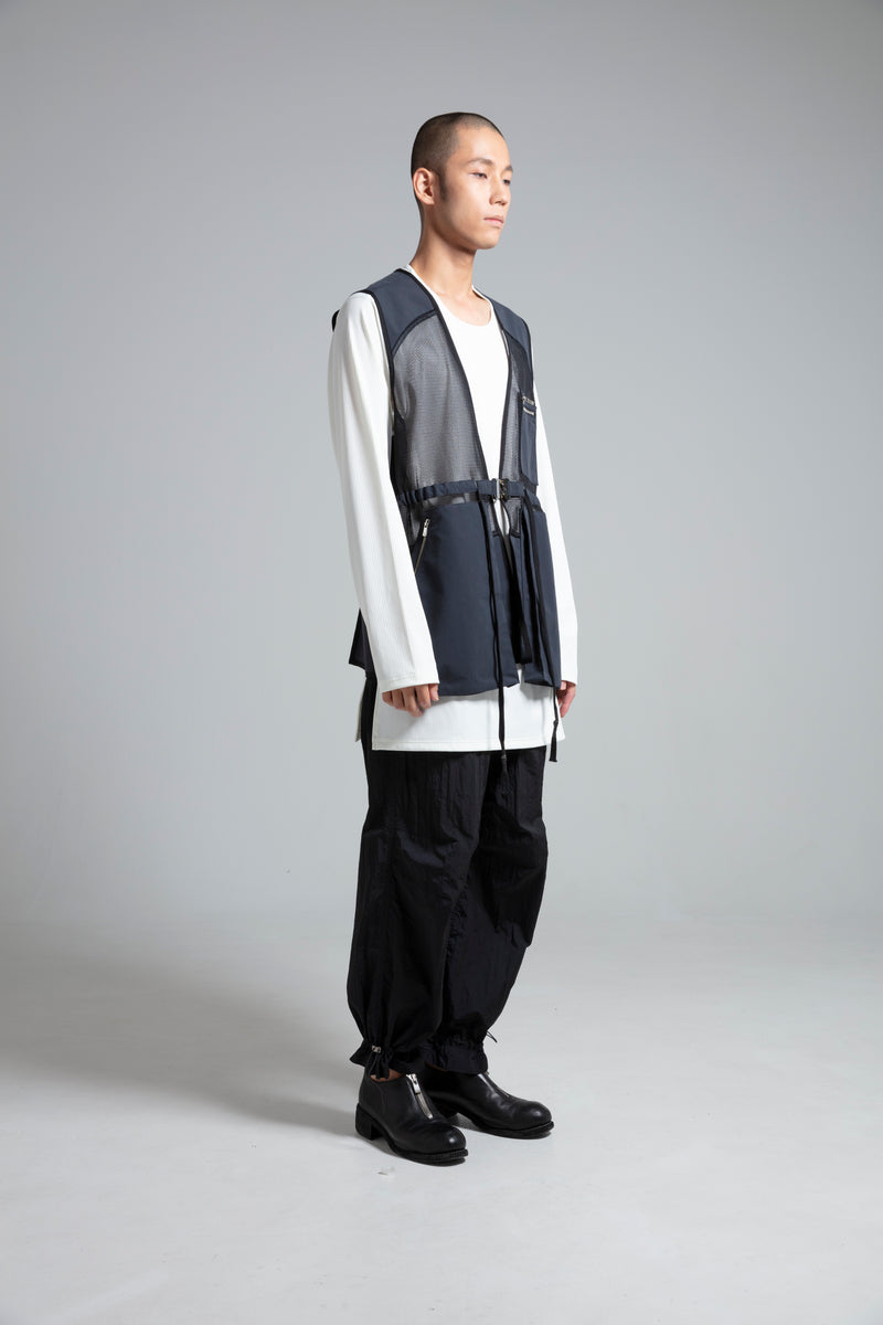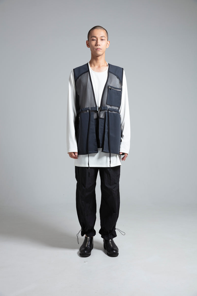 フロントはコブラバックルのみで着脱するデザインで、大ぶり設定のサイズ感やメッシュ地による切り替え、大きく開いた背面センターの仕様も相まって、アウターベストとしての存在感を強く発散するプロダクトとなっている。