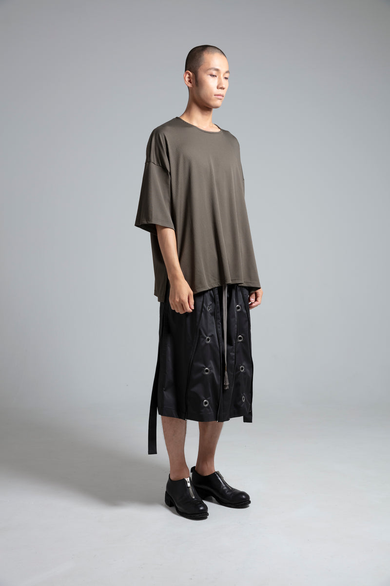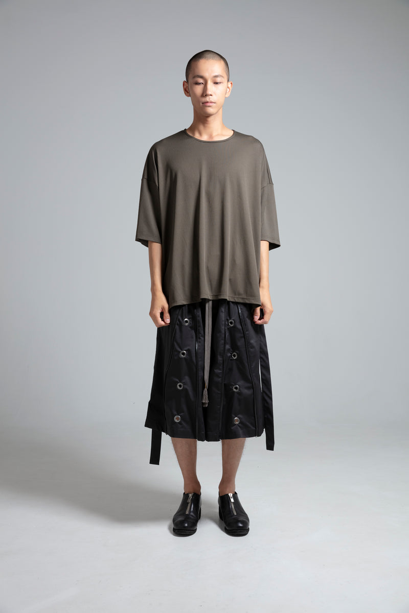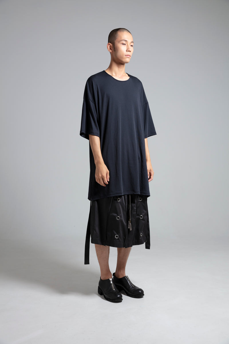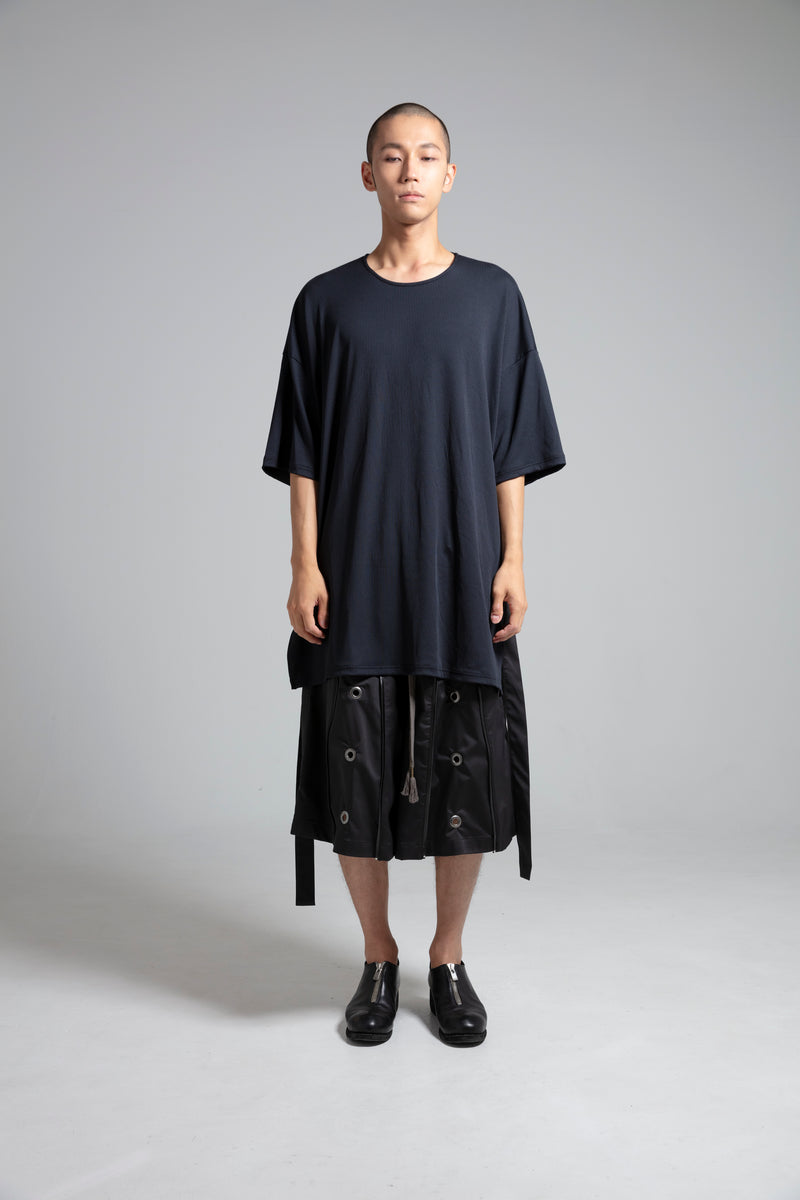 全てのパターンを極めて大きく設定したルーズシルエット、生地特有の落ち感も相まって、要素の少ないデザインながら抜群の存在感を放つ。
