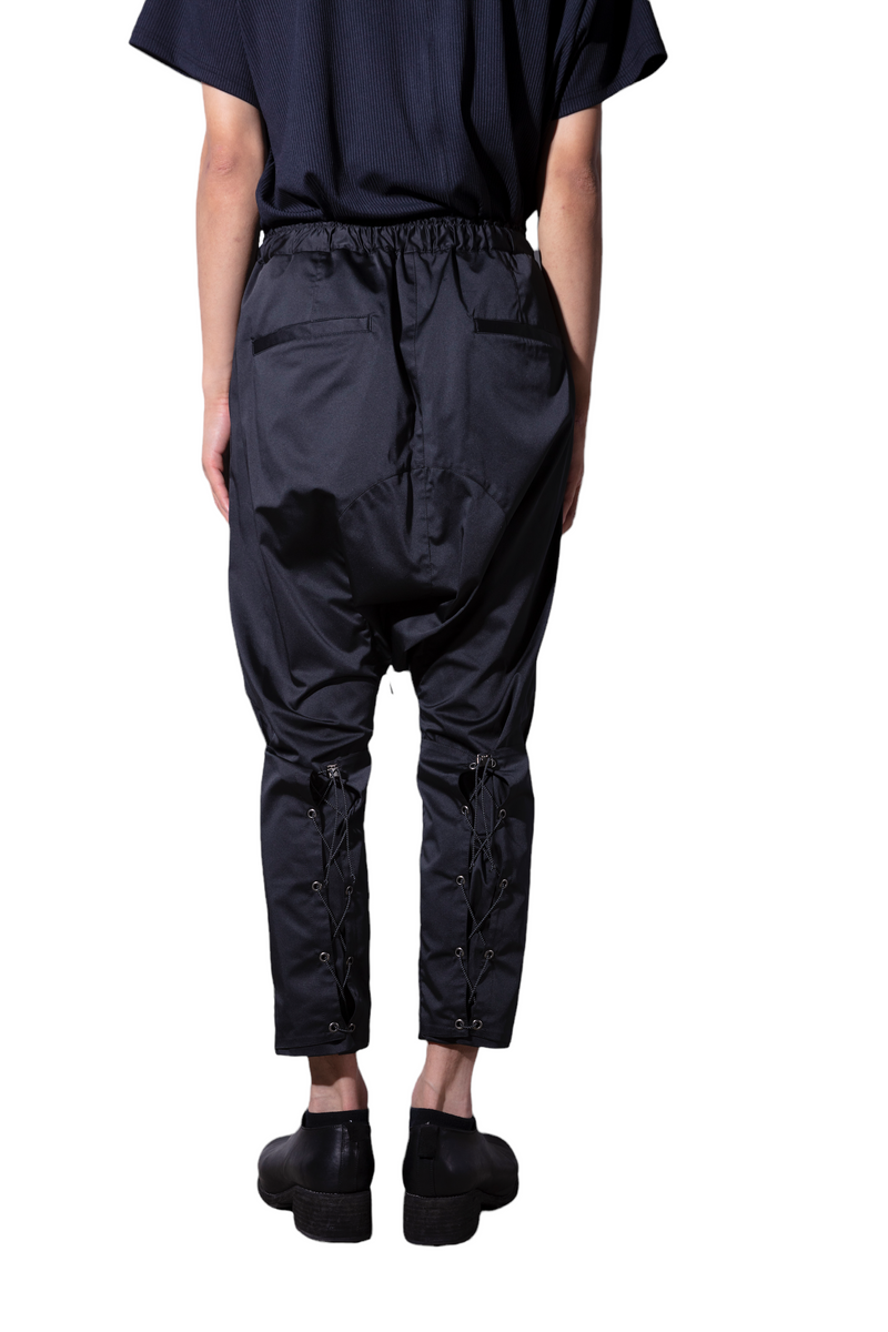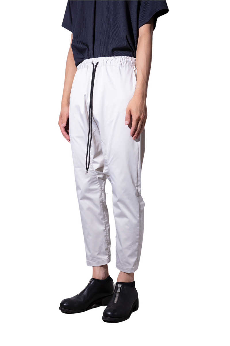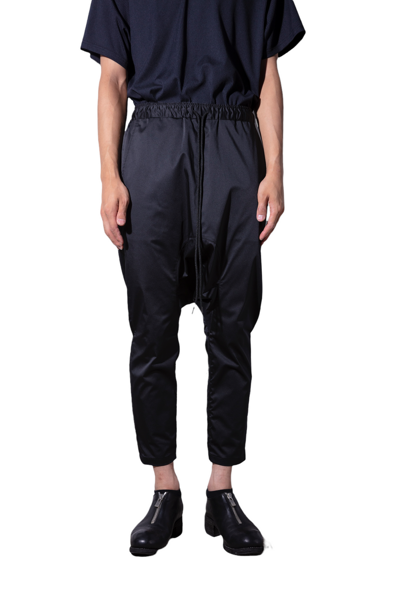 prasthanaが継続的に提案しているドロップスタイルボトムスの新型で、深い股上に付随するゆとりのある腰回りのサイズ設定から、腿から裾にかけて大胆にテーパードさせた独自のバランス感覚で構築。