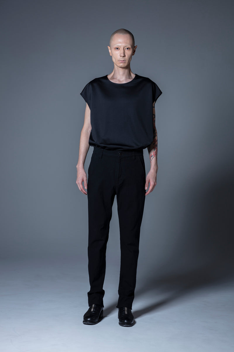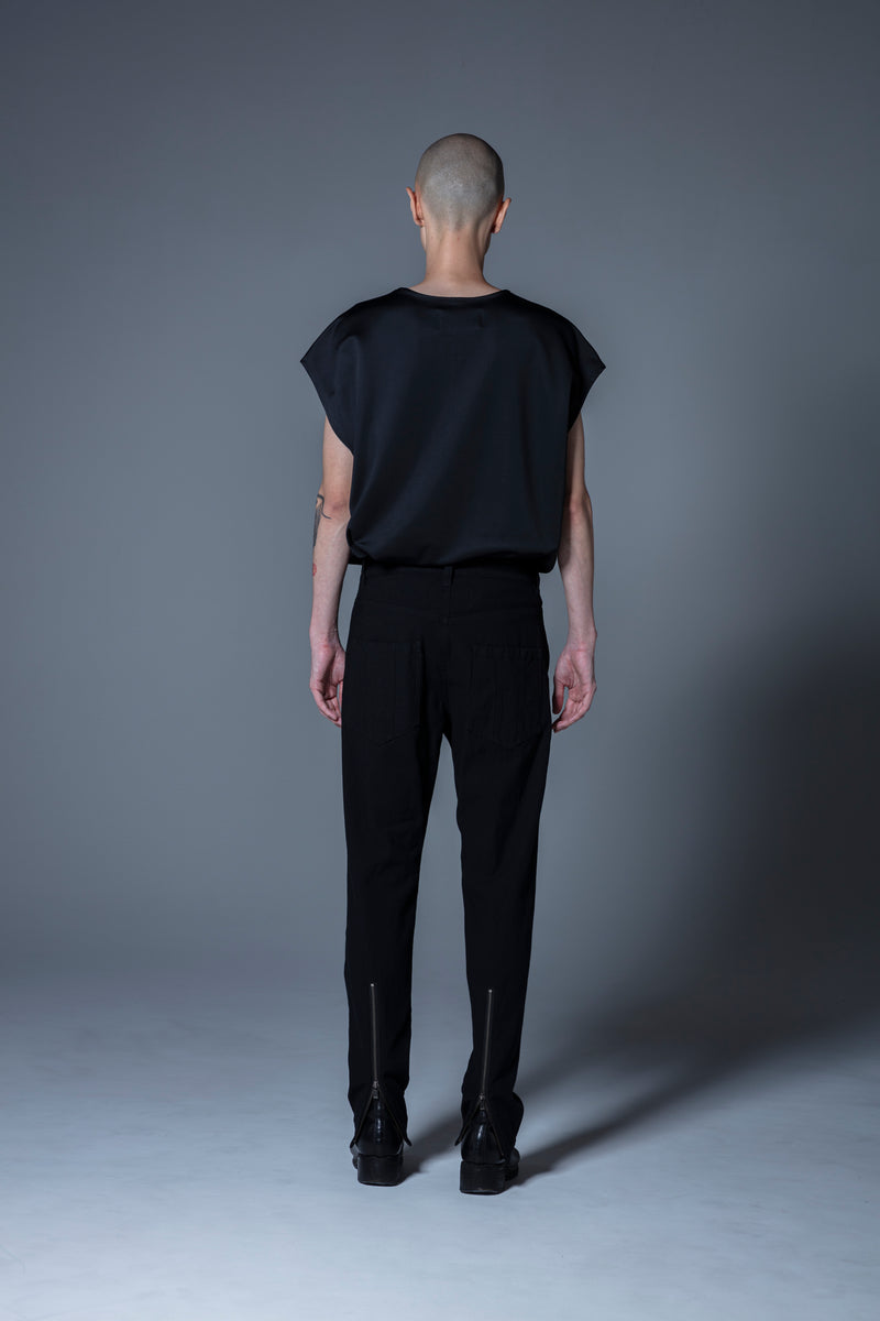 バックヘムにファスナーを配し、開閉する事でシルエットが変化するスリムシルエットのパンツ。