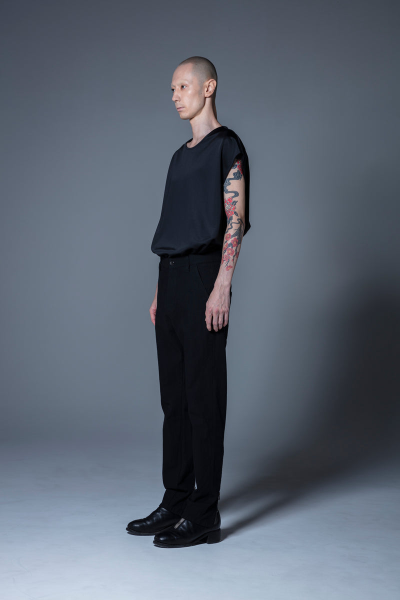 スキニーフィットではなくあくまでもスリムフィット、という製品の着地点は遵守しつつ、昨今のオーバーシルエットの系譜から考えると非常に細く美麗なシルエットとなっており、腿付近に配したダーツの効果も相まって、着用者のスタイルを綺麗に演出する。