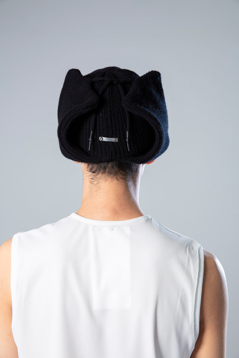 イヤーフラップ下部には同素材のコードを付属しており、頭頂部で結ぶことで固定が可能、2wayでの着用を実現する。