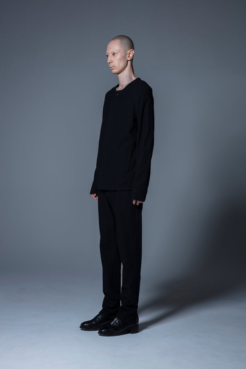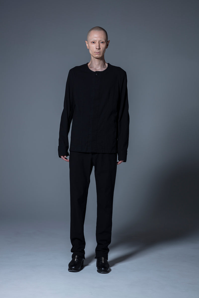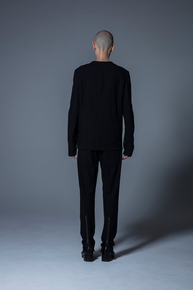 昨今のprasthanaのシグネチャー的な作り込みの一要素である、袖が大きく開閉するファスナーを配し、タイトで硬質なキャラクター像に絶妙な抜けを演出、更にフロントトップボタン以下は比翼の仕様とする事で、無骨なワークウェアのイメージに少しの上品さを付加。