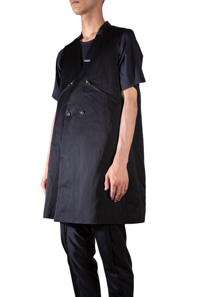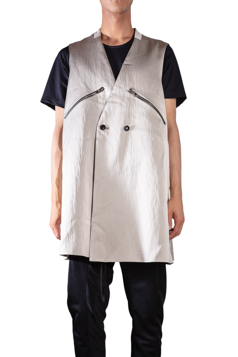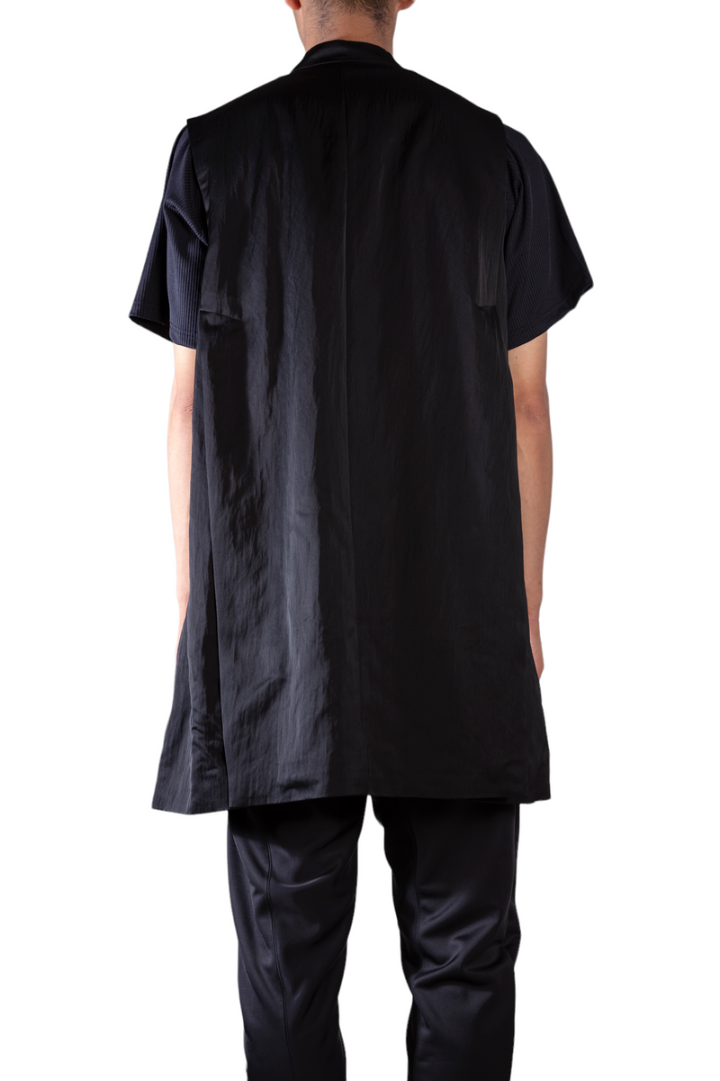 ヴィスコース/ポリエステル混紡のヘビーウェイトサテンを採用したスリーブレスジャケット。