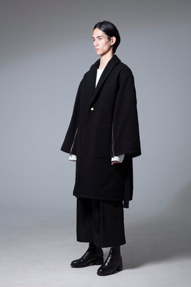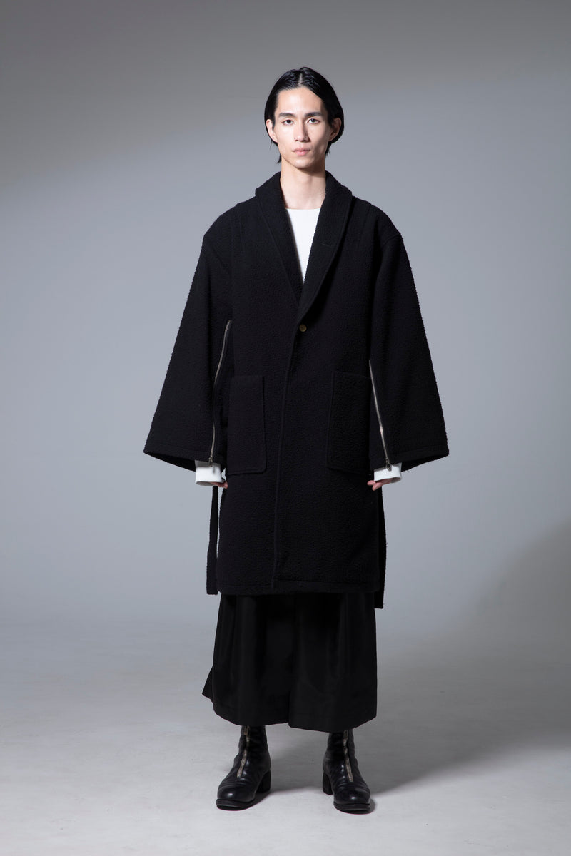 プロダクトのアウトラインは、ゆったりとしたオーバーシルエット、ショールカラーのコートで、両袖にYKK EXCELLAファスナーを配置。