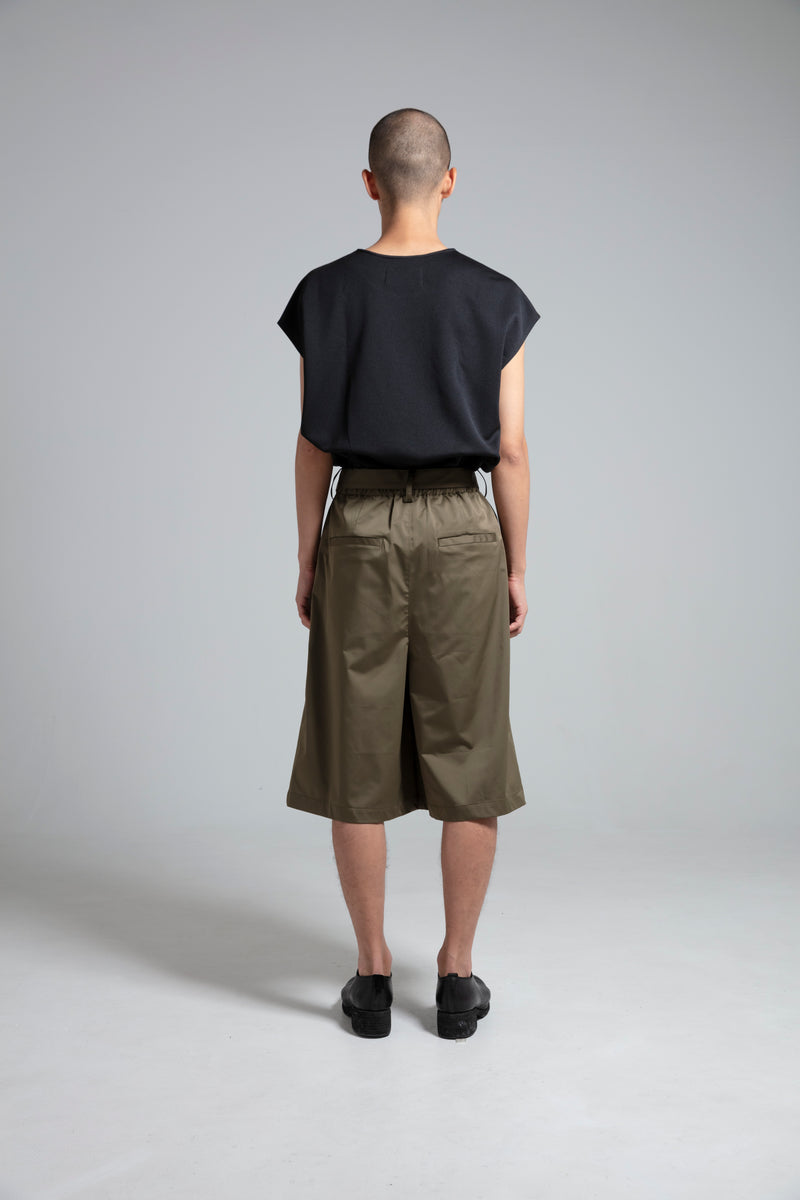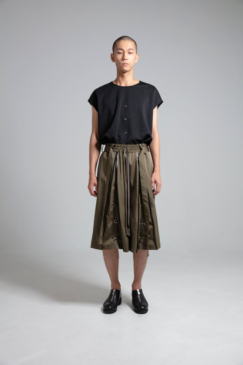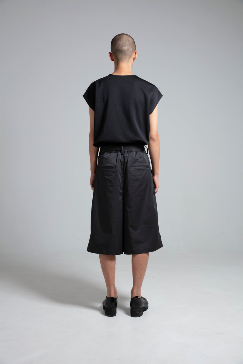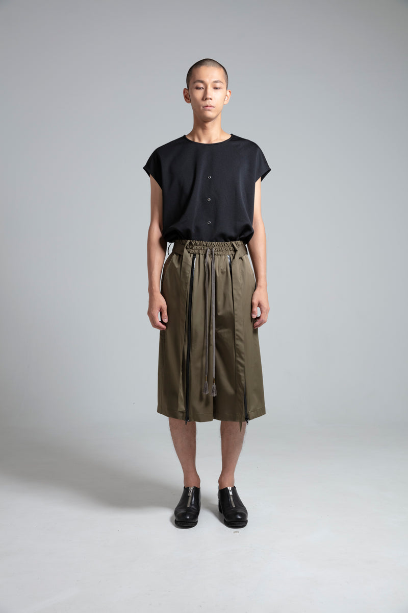 袴をモチーフとしたワイドシルエットで構築した、7〜8分丈設定のショーツ。