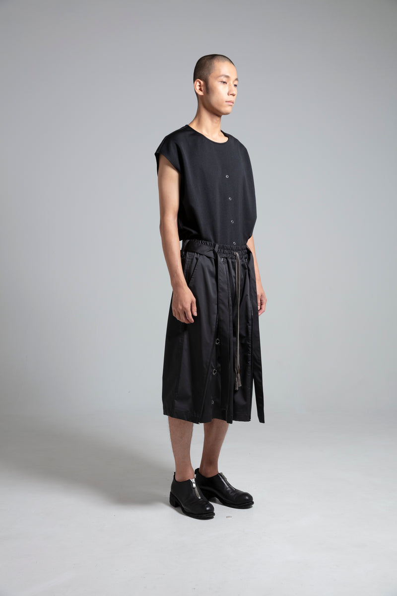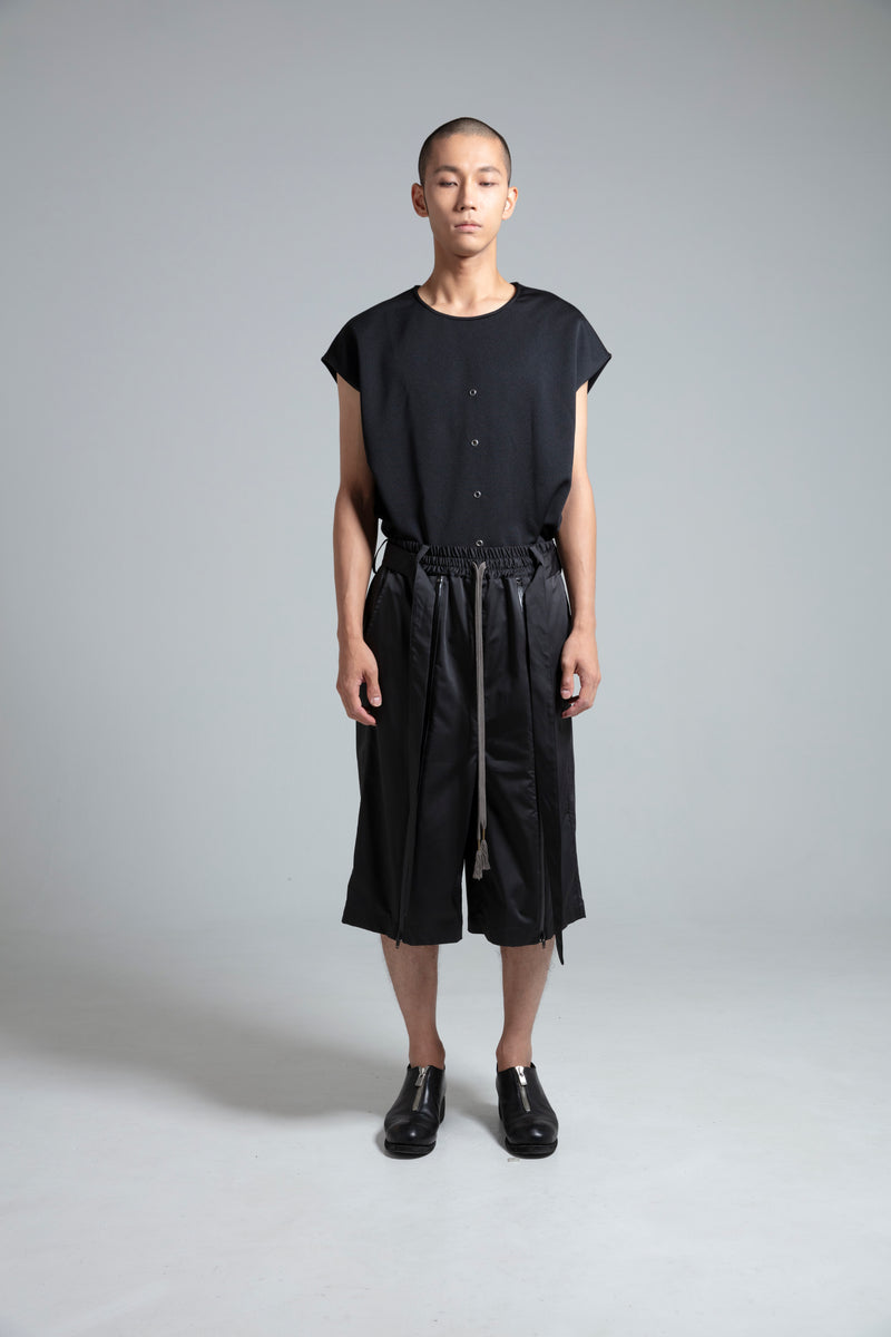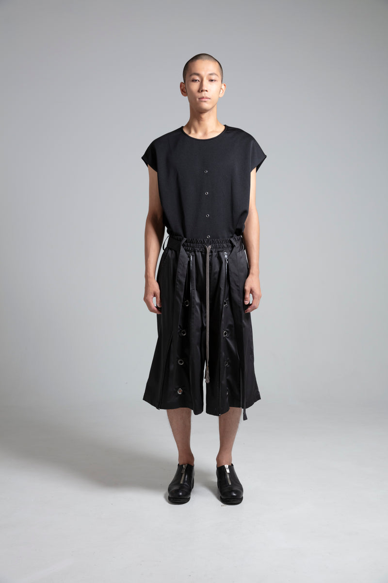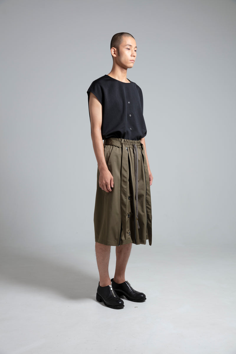 袴をモチーフとしたワイドシルエットで構築した、7〜8分丈設定のショーツ。
