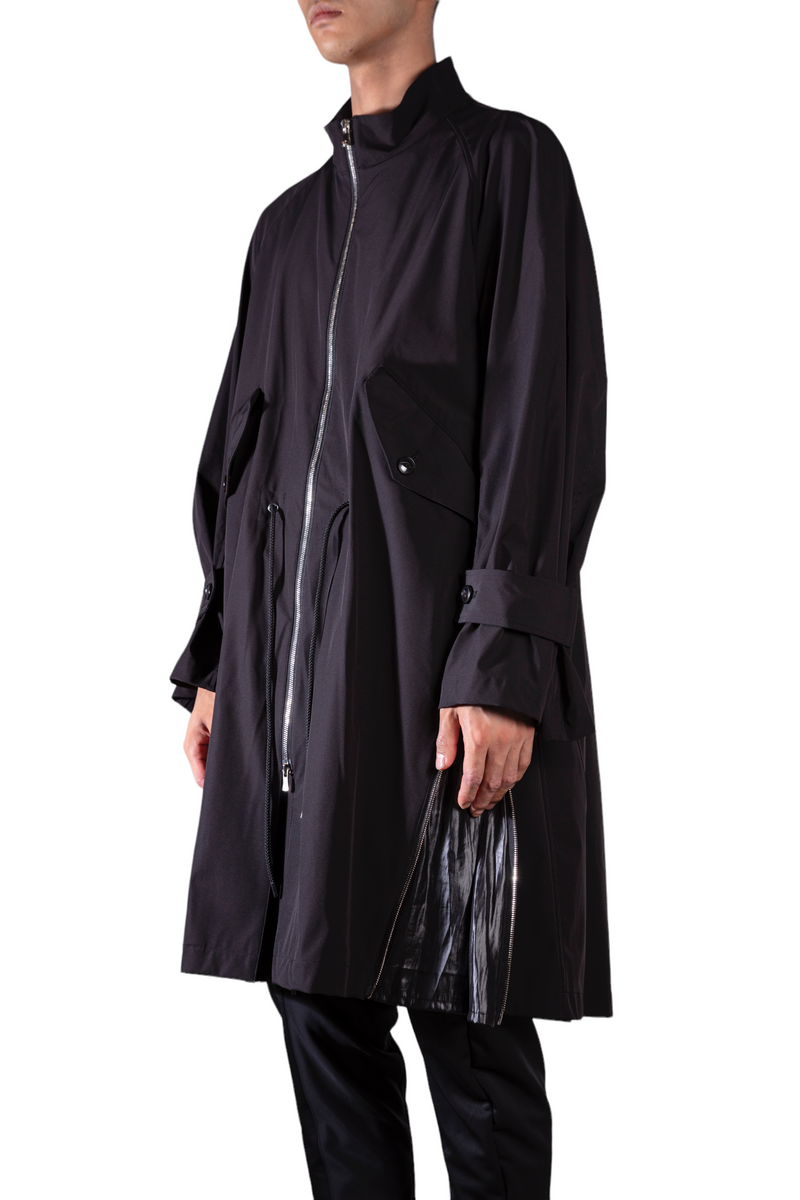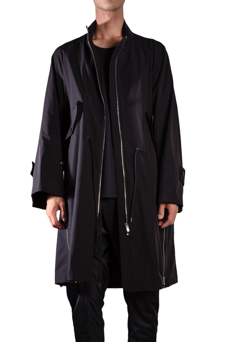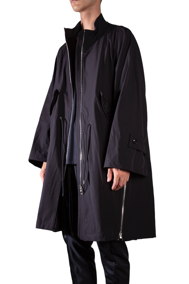 両サイドに配したファスナーを開く事で蹴回しを拡張するデザイン(expansion)にフォーカスし、ミリタリーコートをベースに作成したジップアップスタイルのコート。