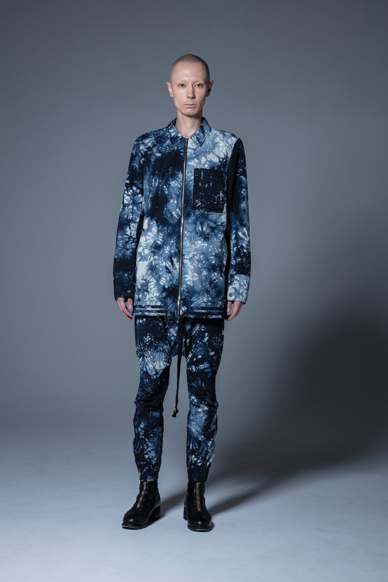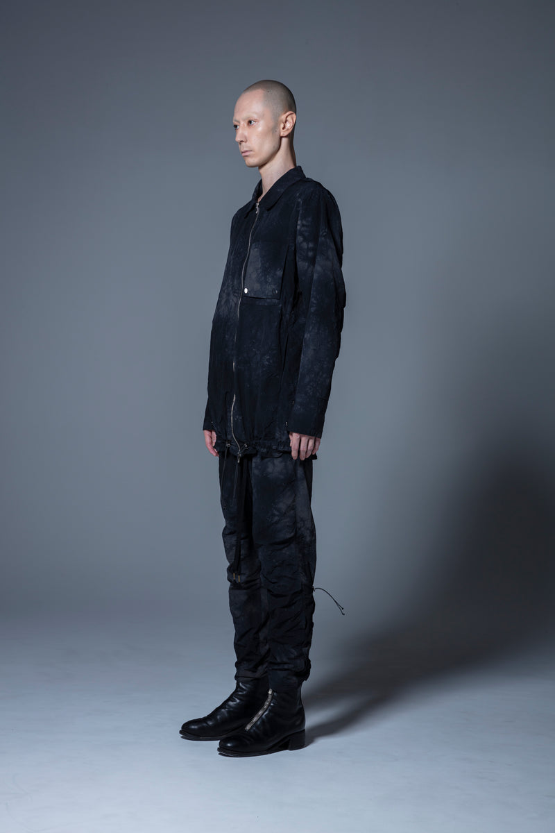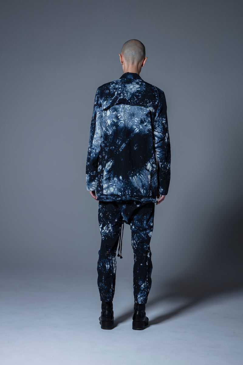 天然素材で用いられるイメージが強い篭染の加工を、prasthanaのフィロソフィーの一要素である[違和感/不調和の創出]の思考に基づき、ナイロンリップストップを素材に選定し、採用した。