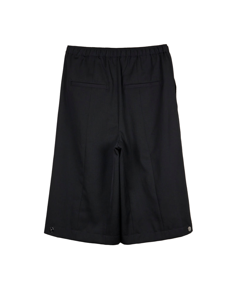 デフォルトの形状はワイドショーツ、裾のコインスナップを留める事で菱形のようなシルエットに変調する。