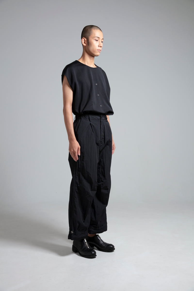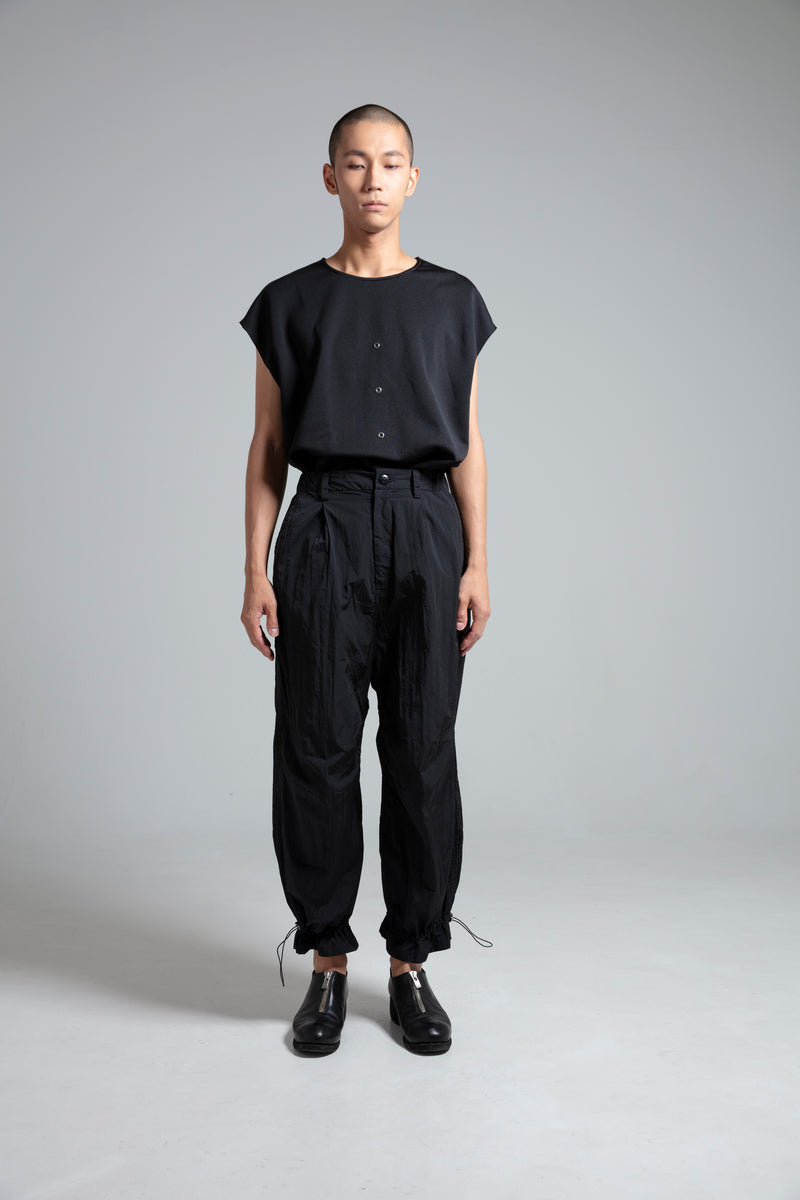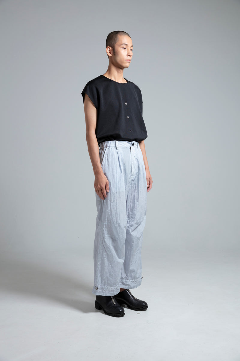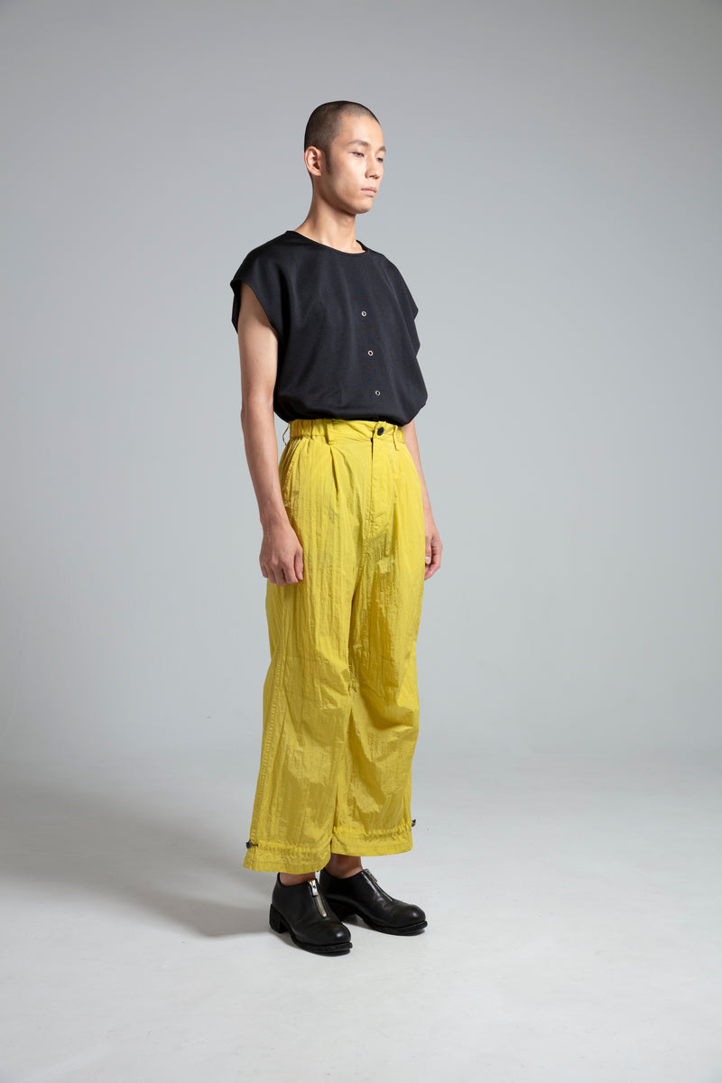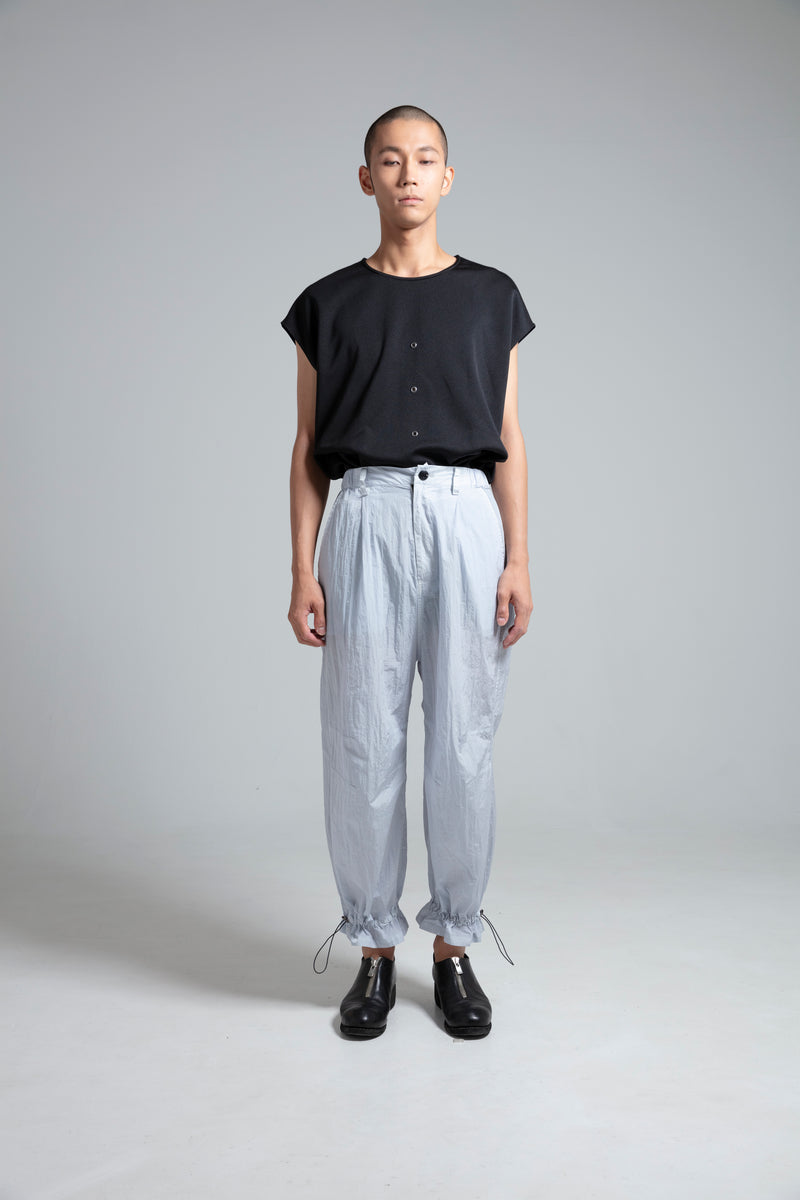 ニータックにフォーカスした、パターン上はストンと落ちたストレートシルエットですが、裾に配したドローストリングを絞ることでシルエットが大きく変化する。