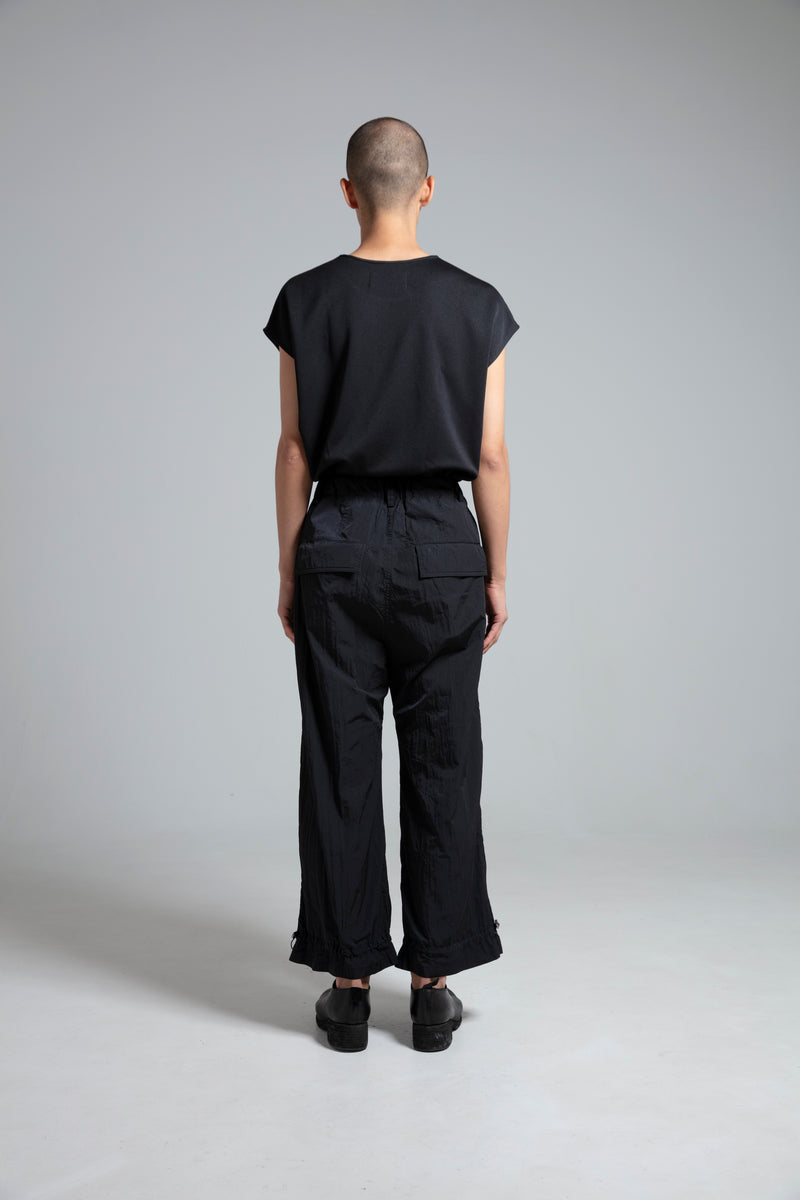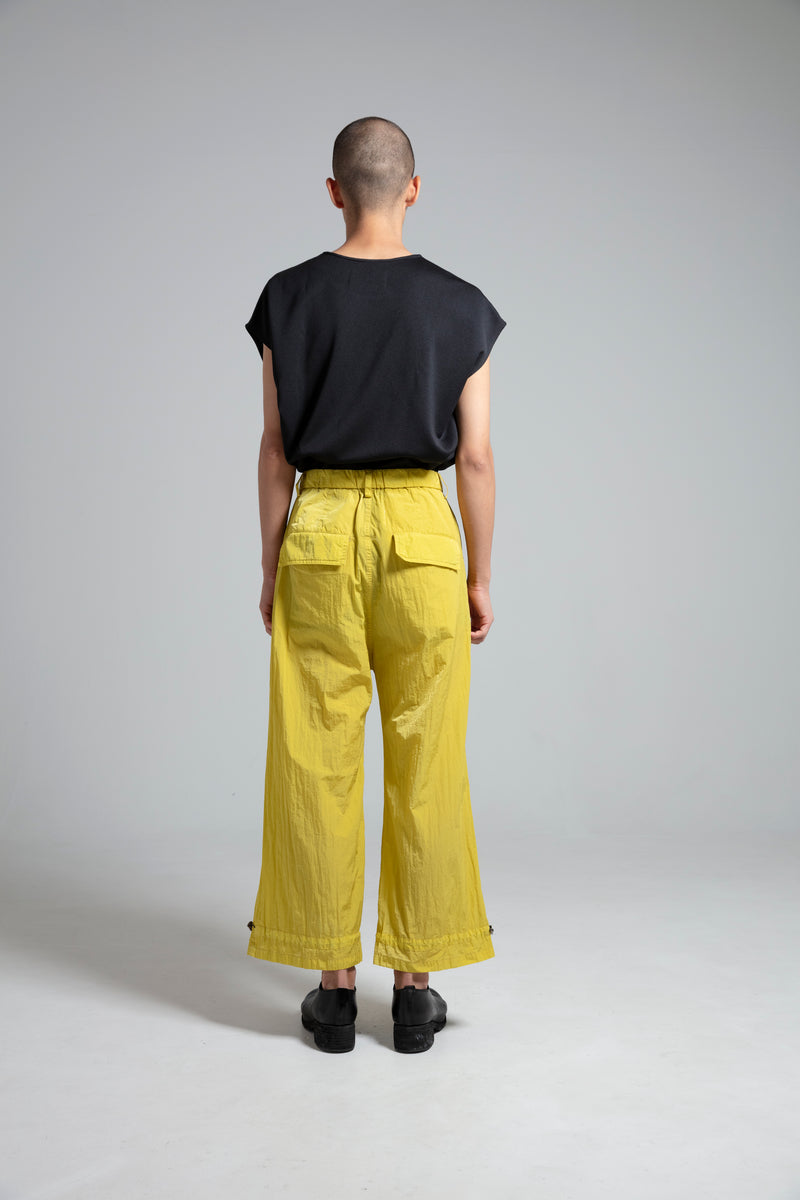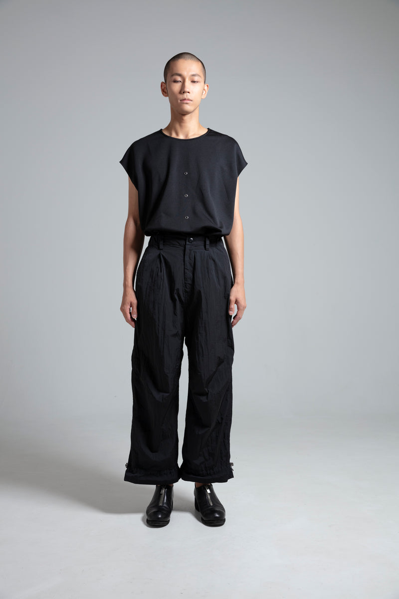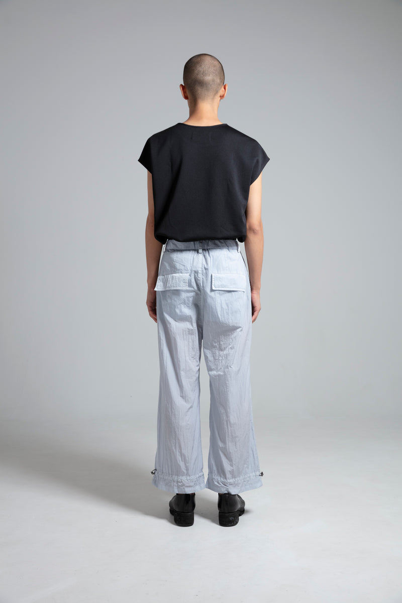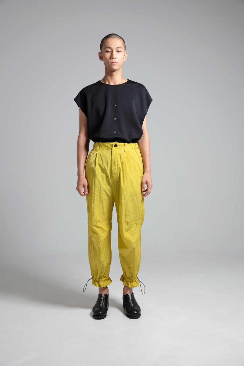 ニータックにフォーカスした、パターン上はストンと落ちたストレートシルエットですが、裾に配したドローストリングを絞ることでシルエットが大きく変化する。