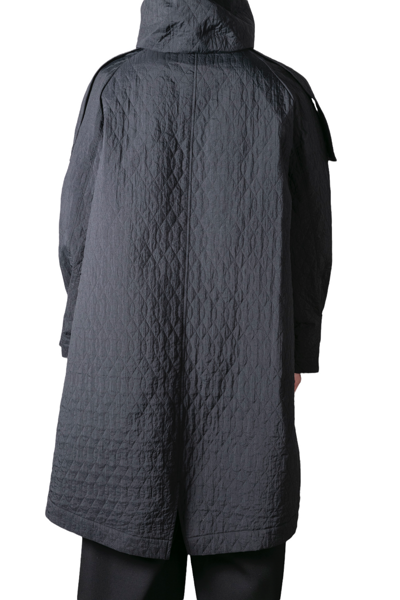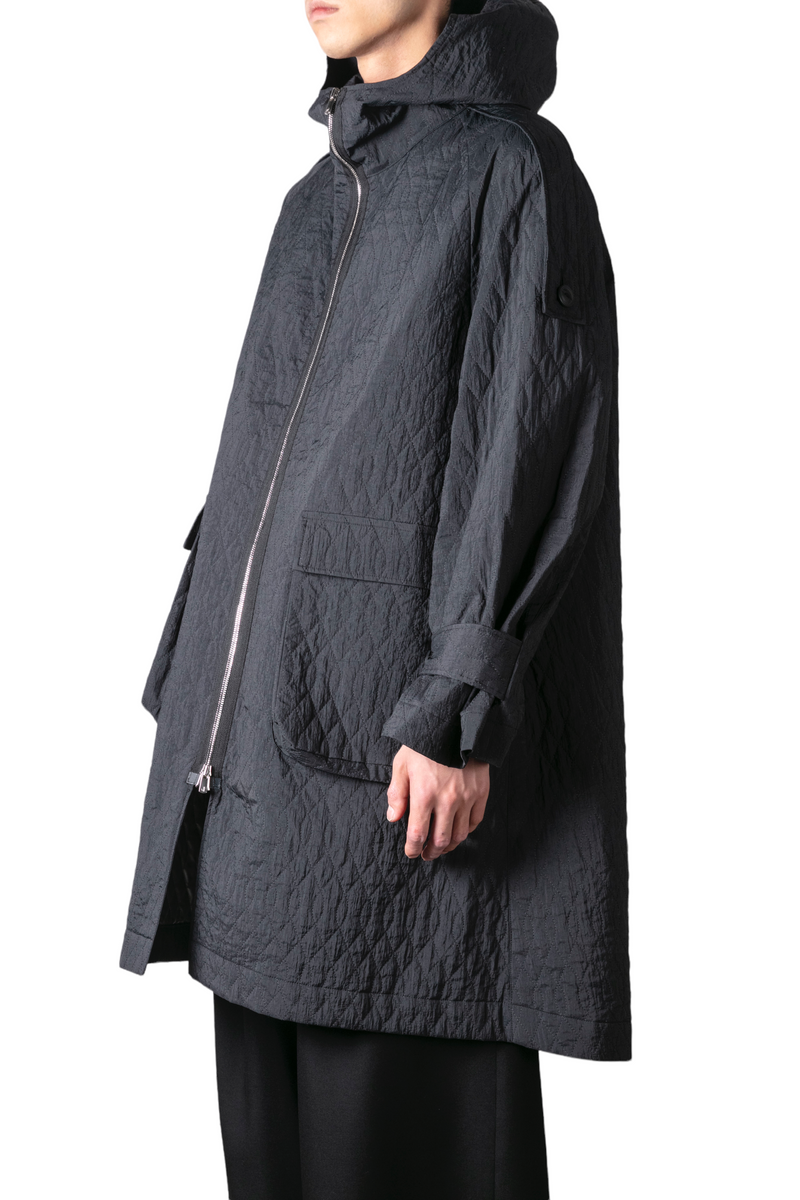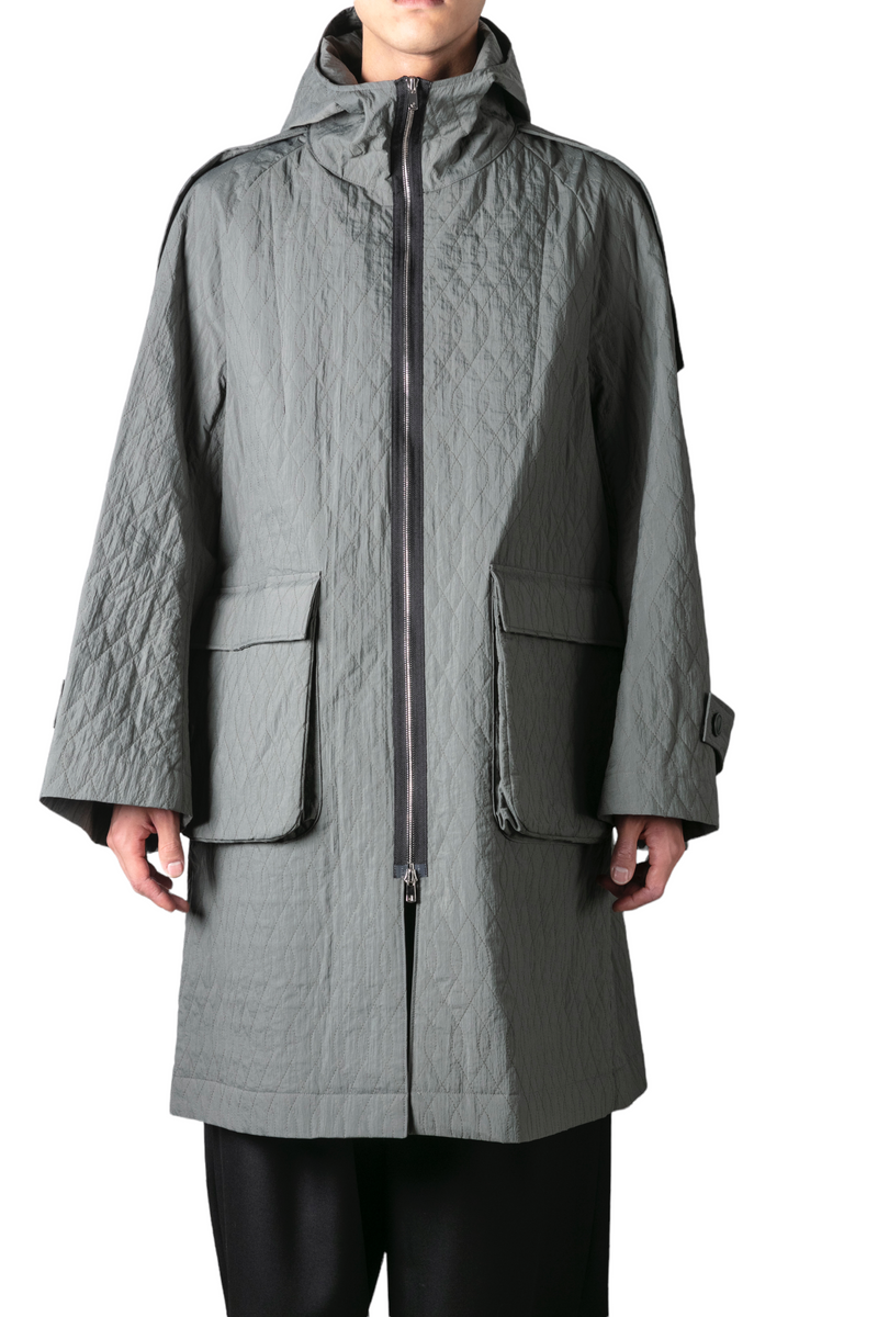 塩縮ナイロン/中綿/シルバーコーティングナイロン生地を使用し、キルティング加工を施したオリジナル生地を採用したフーデットコート。