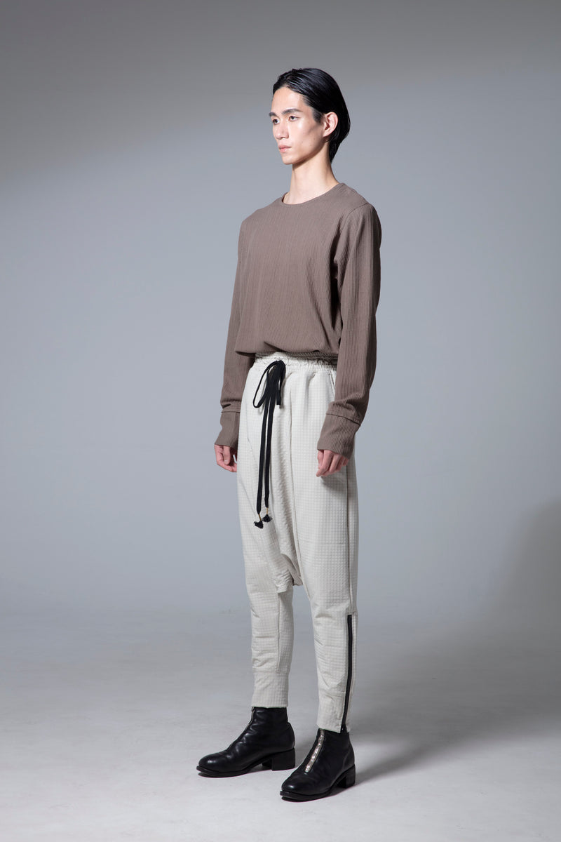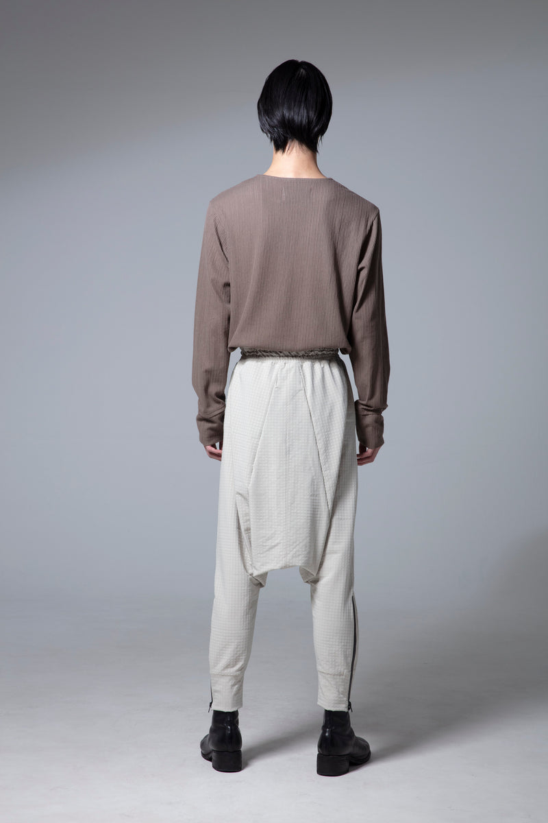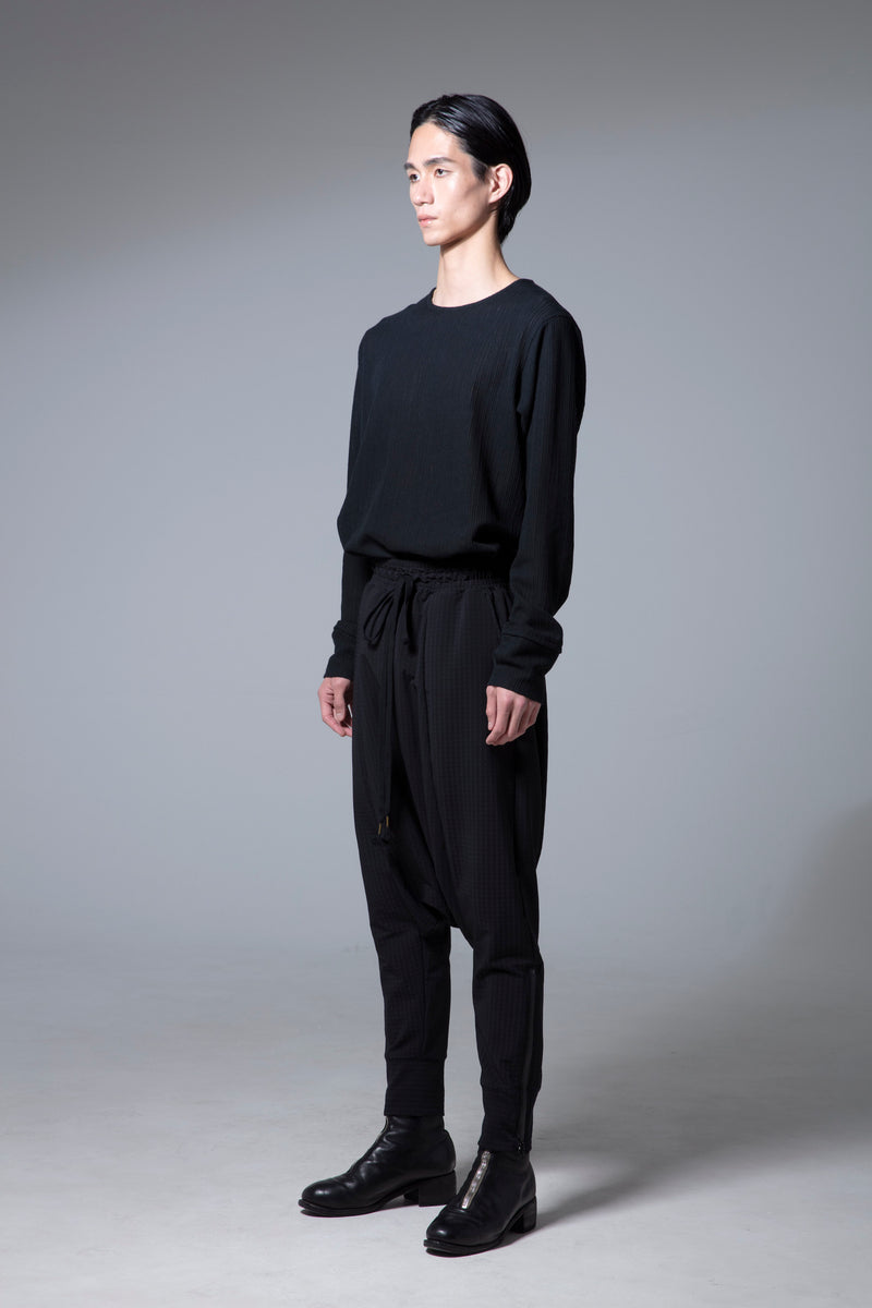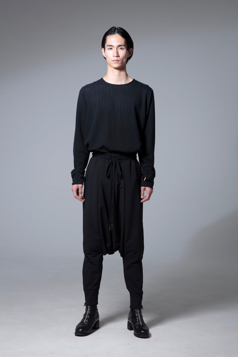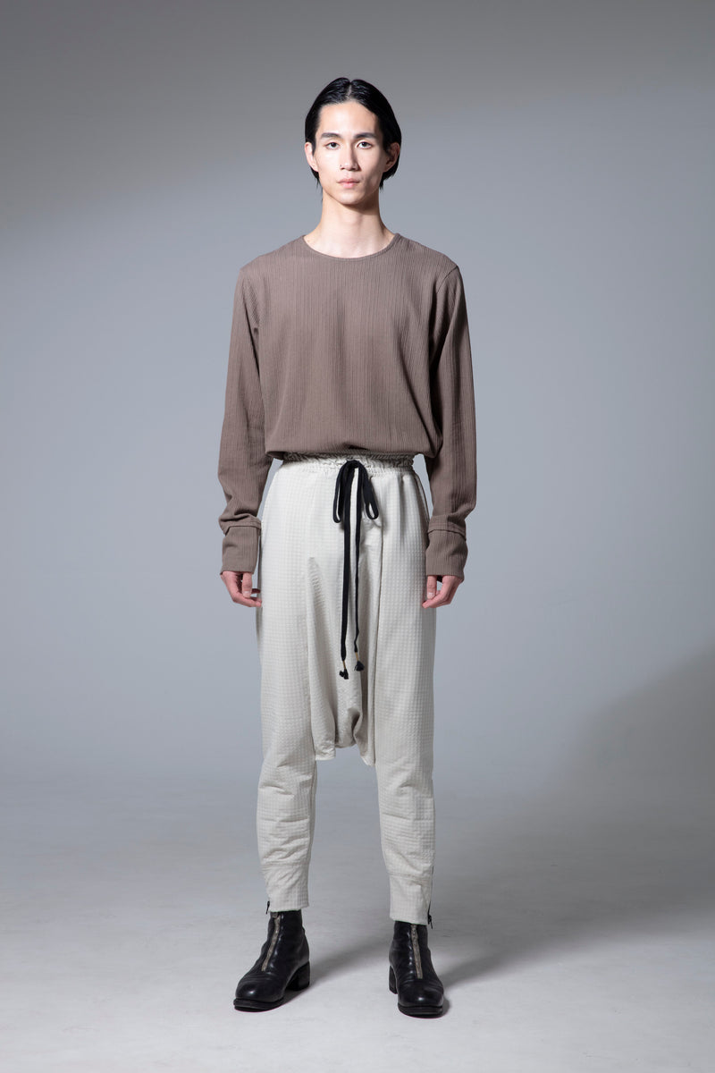 重心を落としたサルエルシルエットのパンツは、ブランド設立以来常に提案を続けているアイテムで、標榜しているドロップスタイリングの核となる一要素。