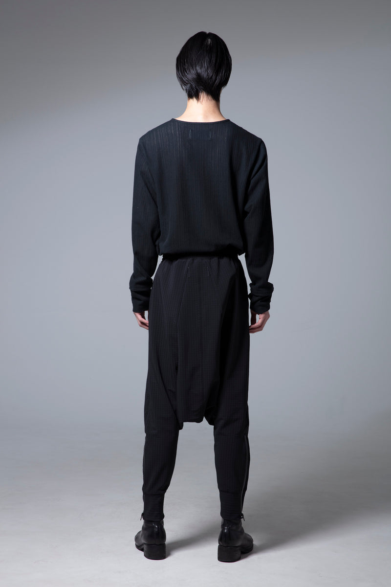 大きくゆとりを持たせた股上と対照的に、脚部(筒部分)はスキニーなフィットとなっており、そのシルエットのギャップが、このプロダクトの独自性を鮮明に表現するファクターとなっている。