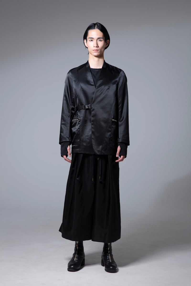 フロント合わせのバックル使いが印象的なラペルレス型ジャケット。