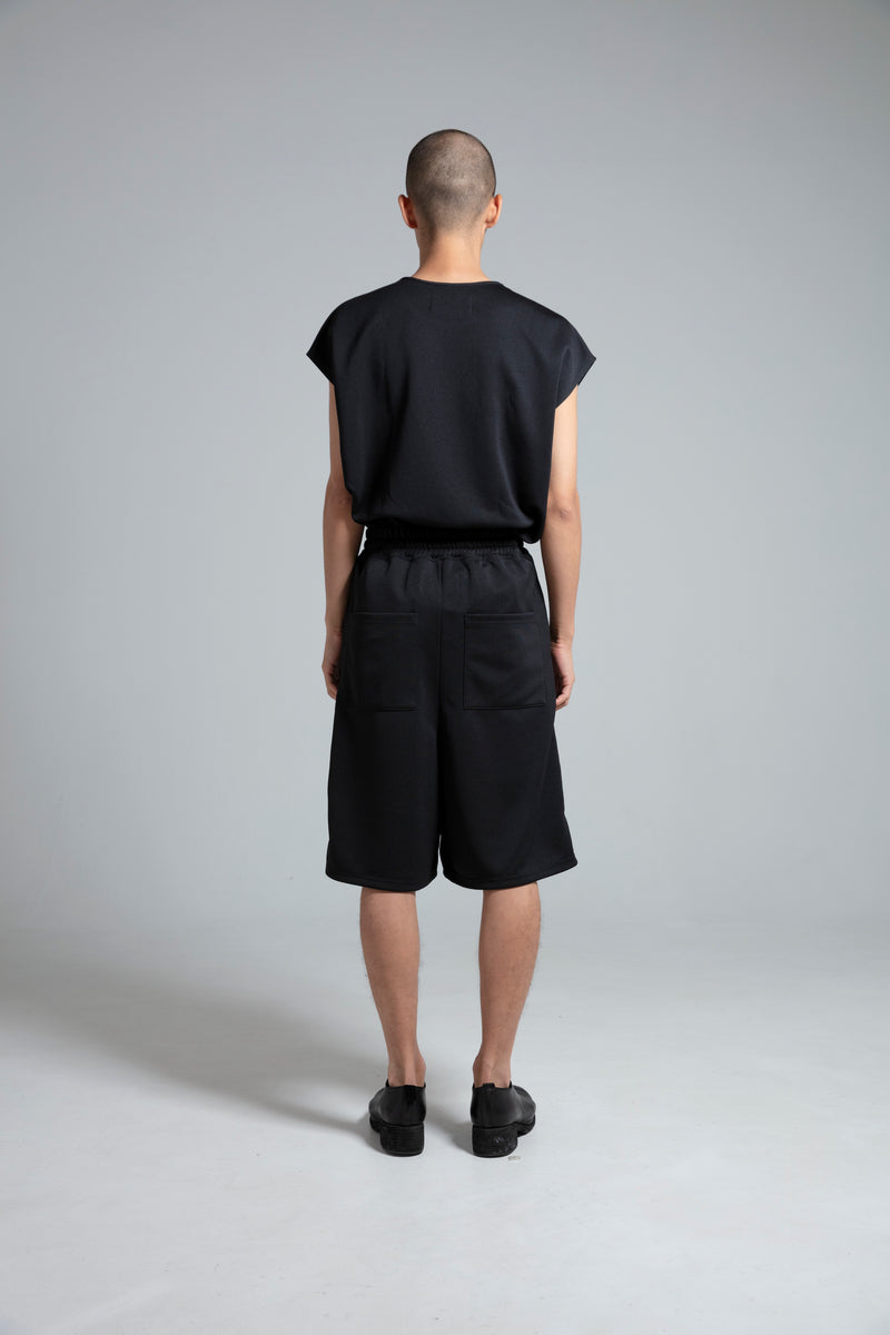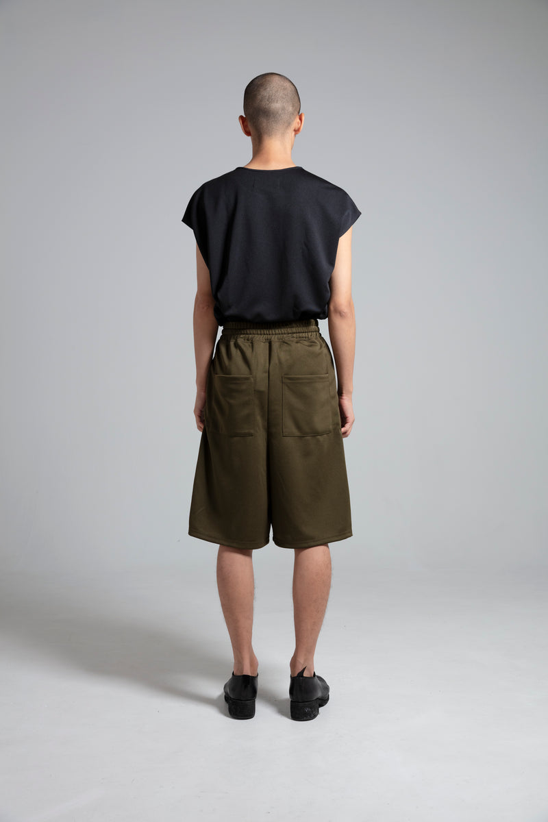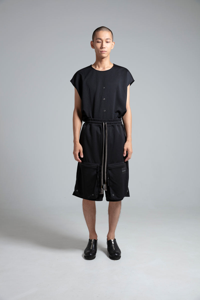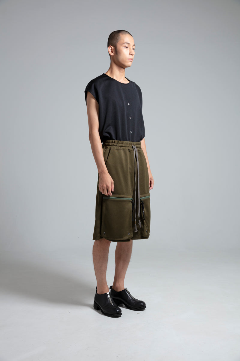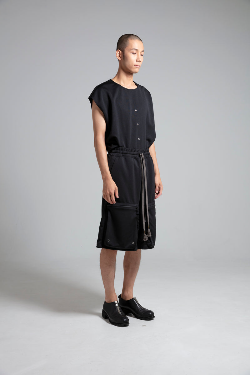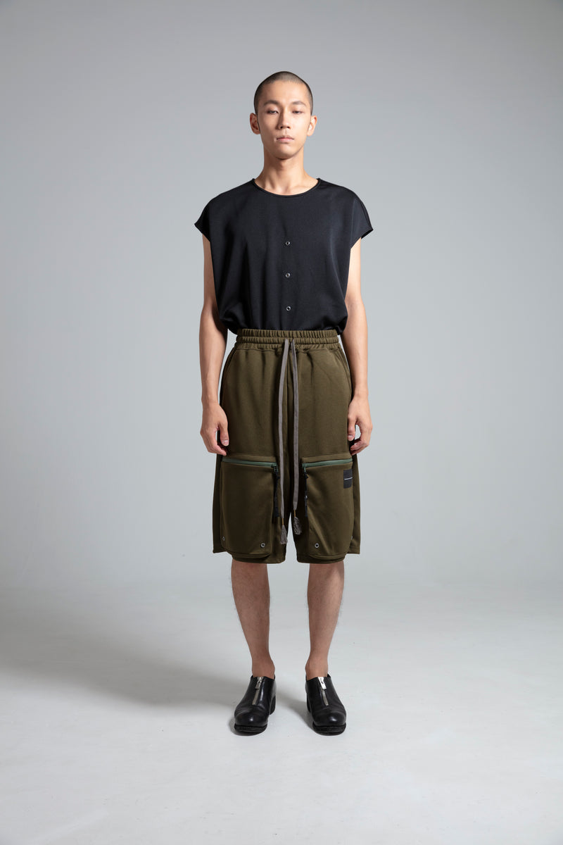 ウエストゴム+ドローストリングによるイージーパンツ仕様、ストンと落ちた癖のないショートパンツのシルエットをベースに、フロント両裾に大振りなパッチポケットを付属、一般的なカーゴパンツとは異なる意匠でありながら、無骨な存在感を放つアイコニックなデザインとしている。