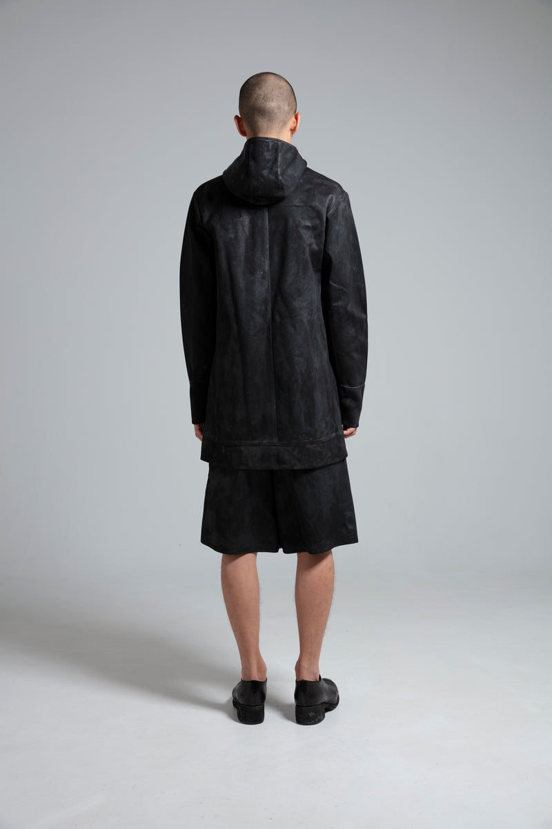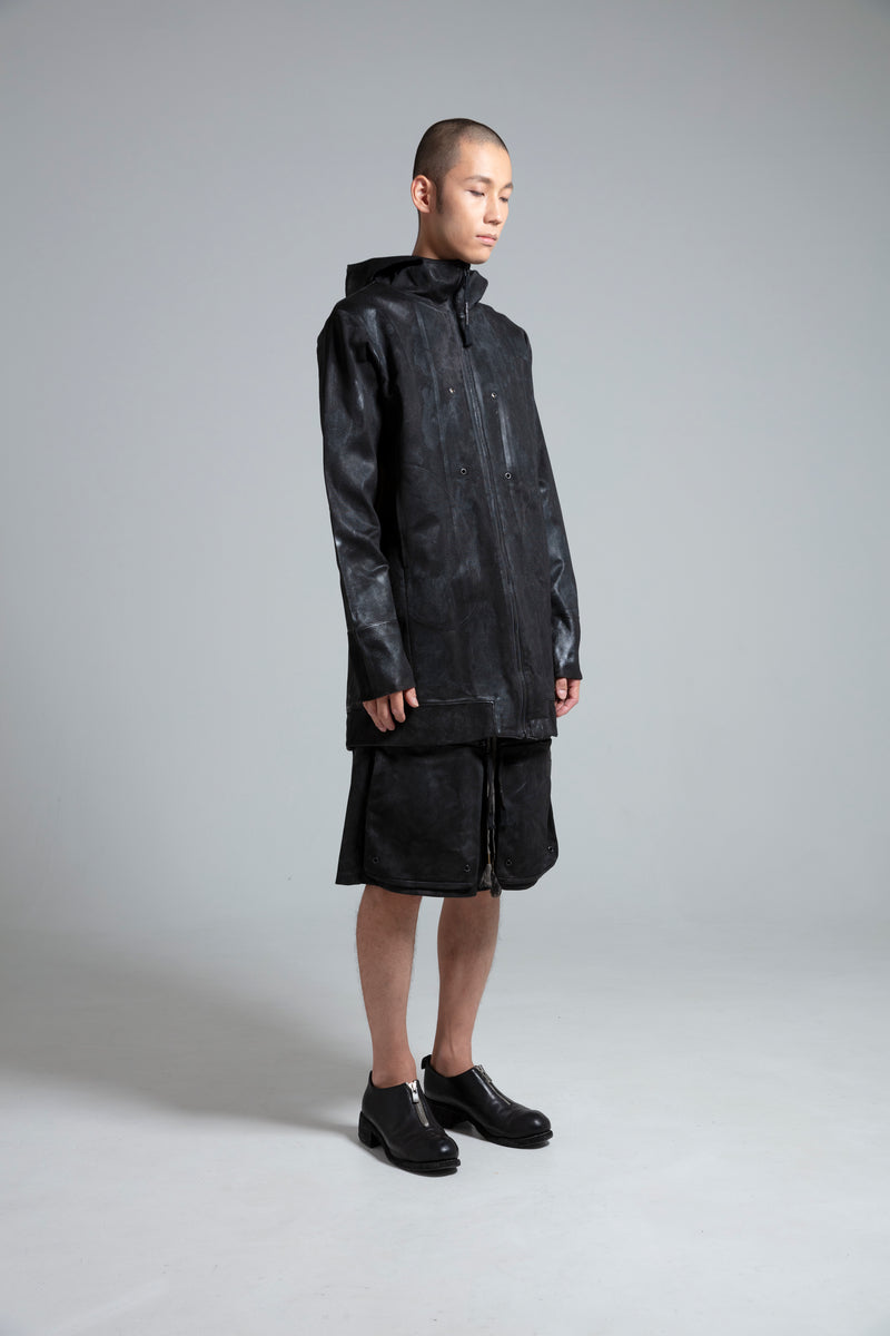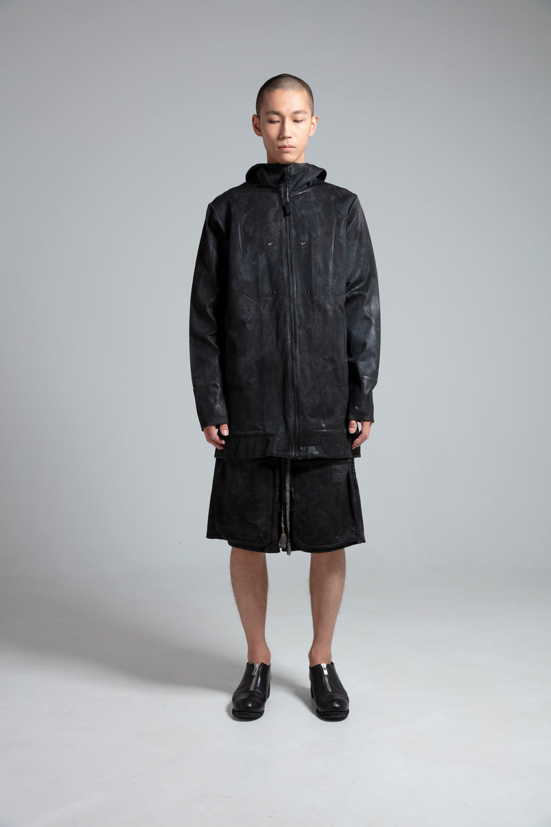 カジュアルゾーンに陥りがちなパーカというアイテムを、ロング丈設定をはじめとし、細部のディテールを磨き上げることで、緊張感のある衣服として成立させている。