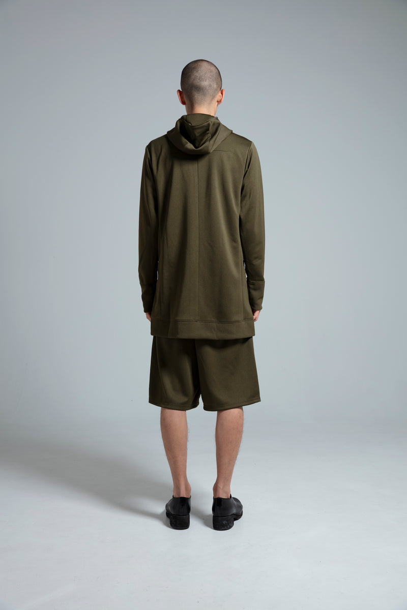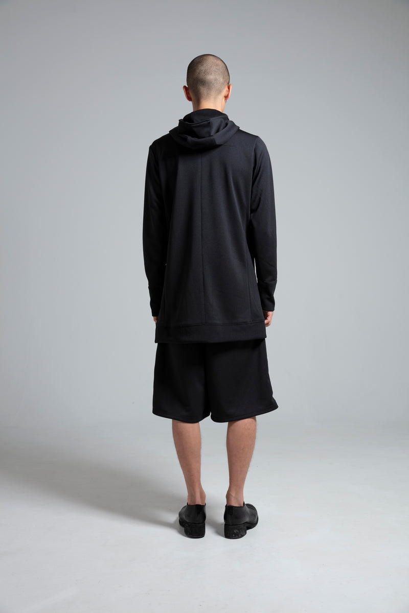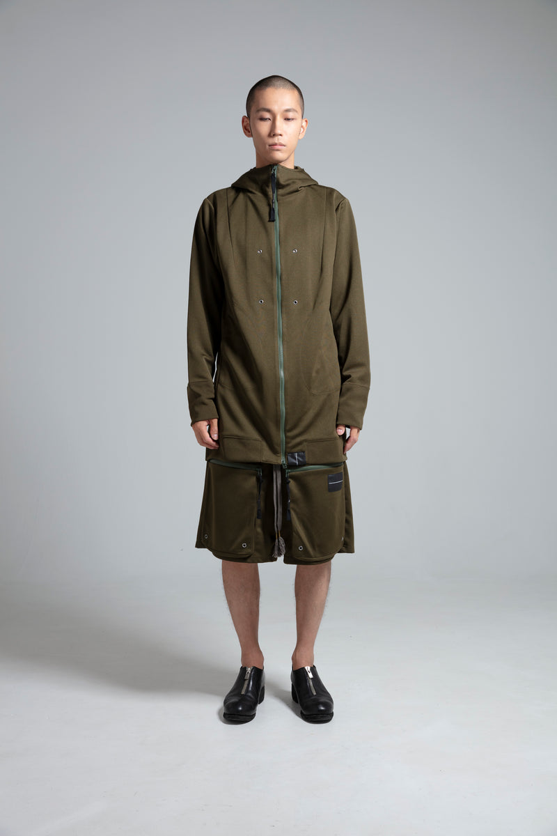 カジュアルゾーンに陥りがちなパーカというアイテムを、ロング丈設定をはじめとし、細部のディテールを磨き上げることで、緊張感のある衣服として成立させている。