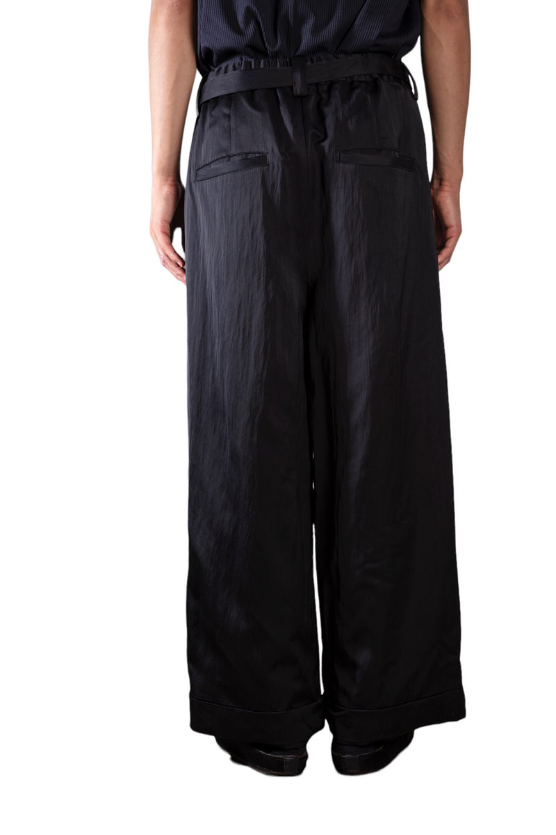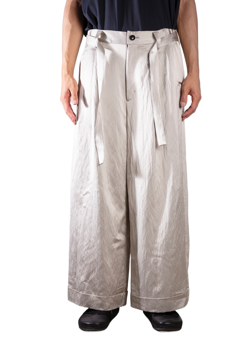 ヴィスコース/ポリエステル混紡のヘビーウェイトサテンを採用したワイドトラウザー。