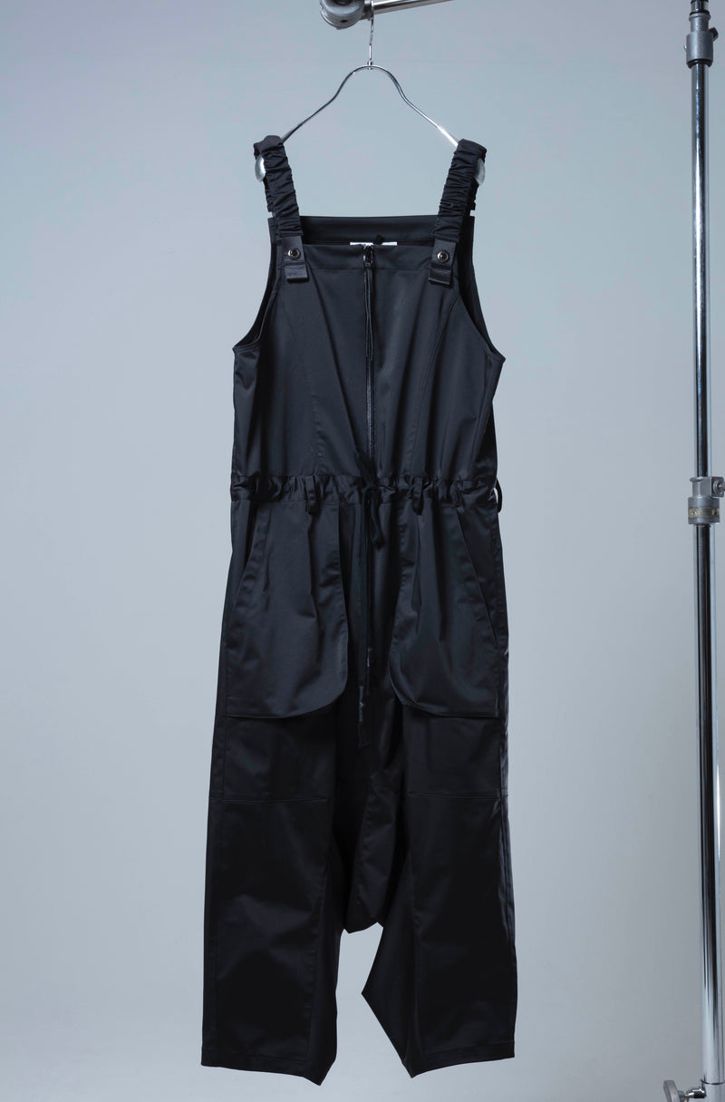 股上を深く設定したドロップスタイルで形成したオーバーオール。