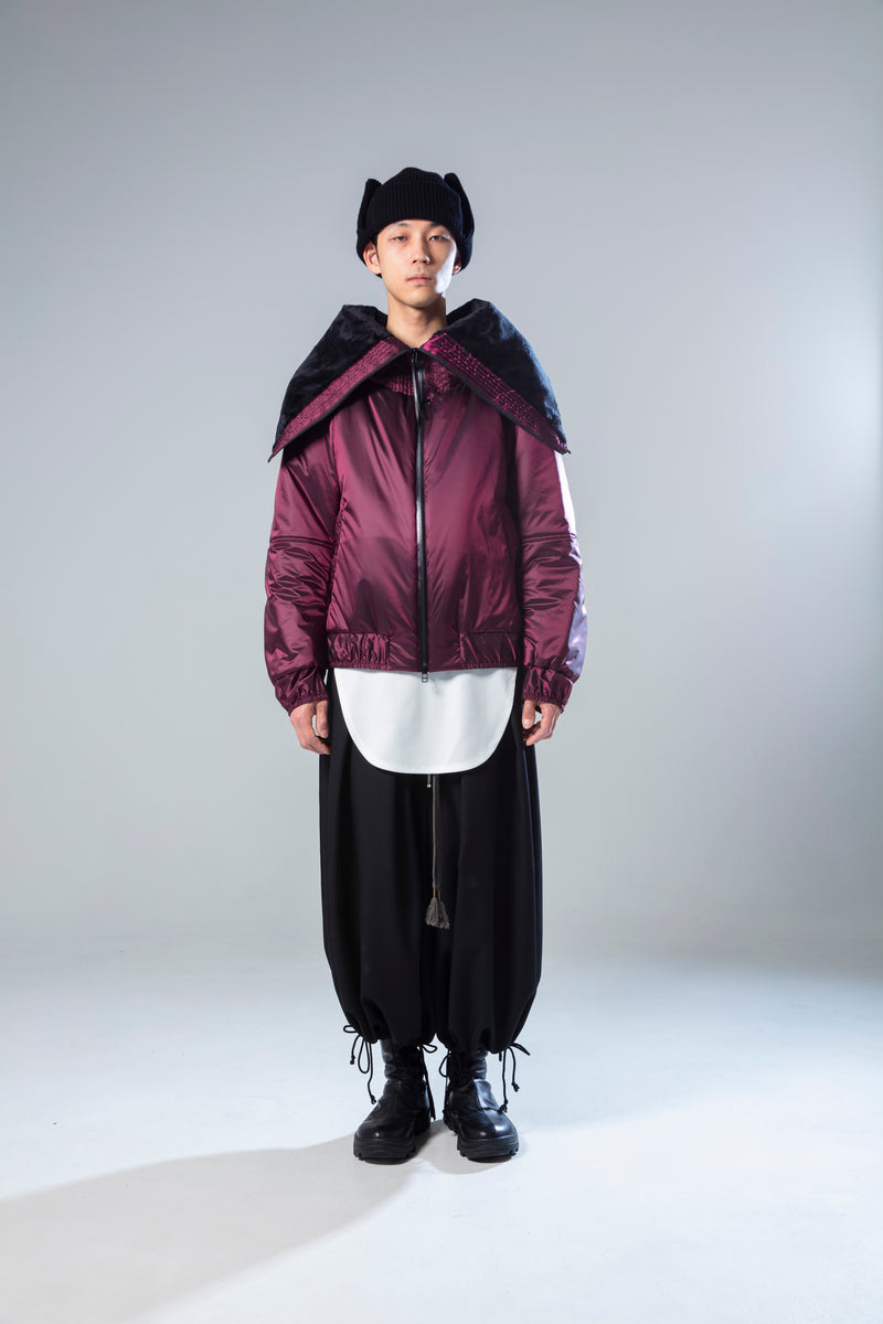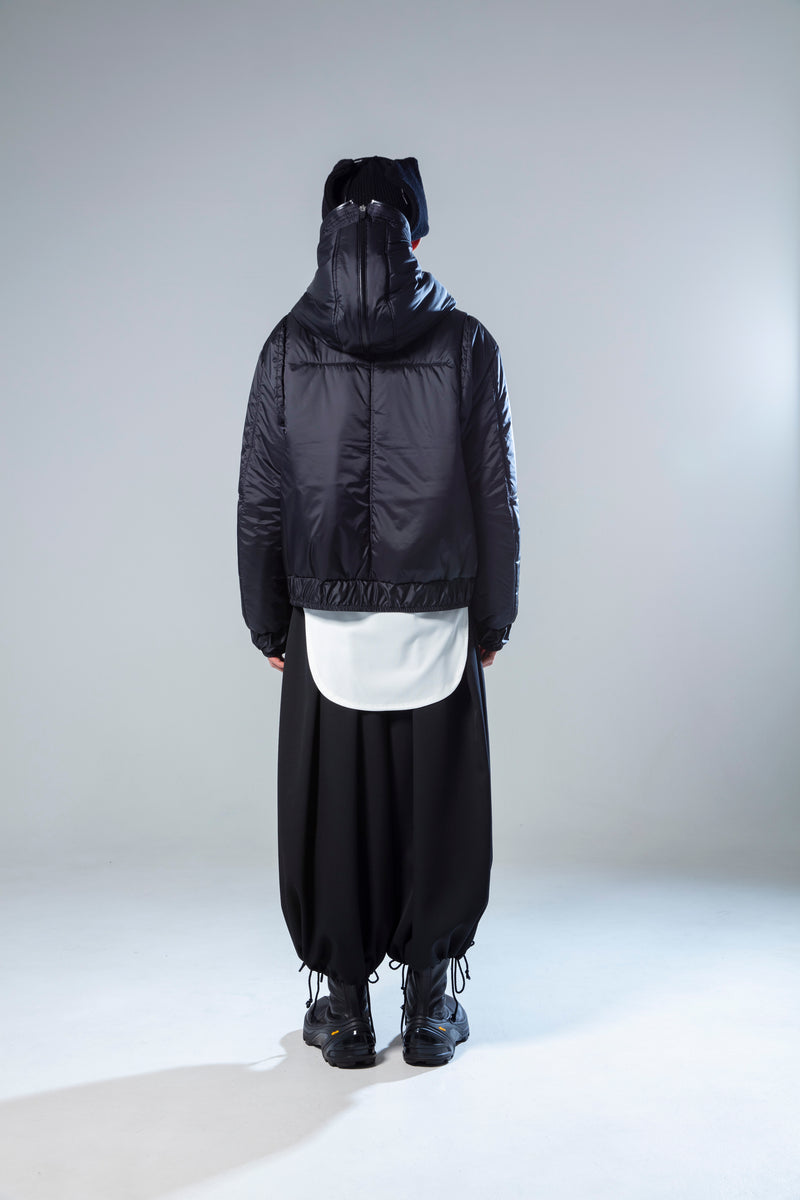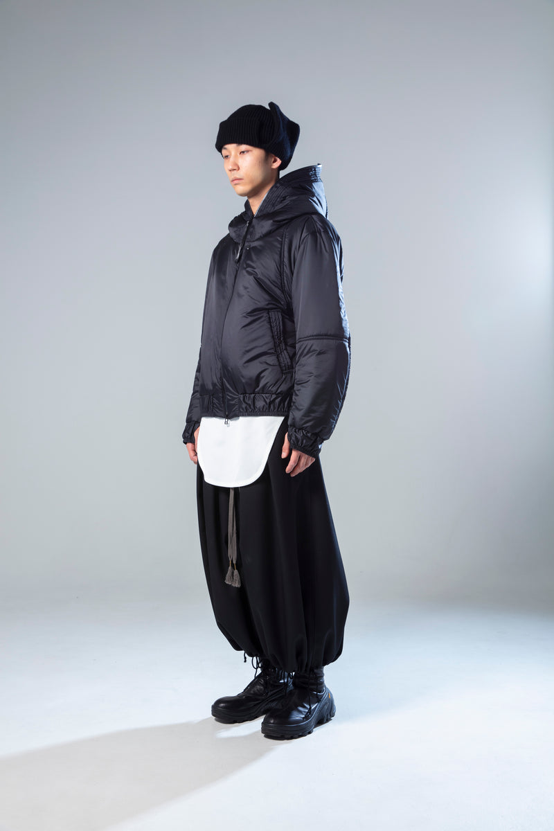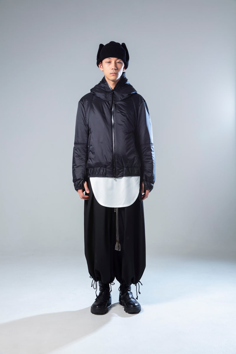 その他、サムホールを配した袖口、背面のアクションプリーツ、人体の可動域に即して各所に走らせたダーツや、ファスナー引手に付属するカウレザー製のテープなど、緻密な作り込みからは、prasthanaにおける創作の主要素である「TECH」「BAUHAUS」のインスピレーションを体感することができるものとなっている。
