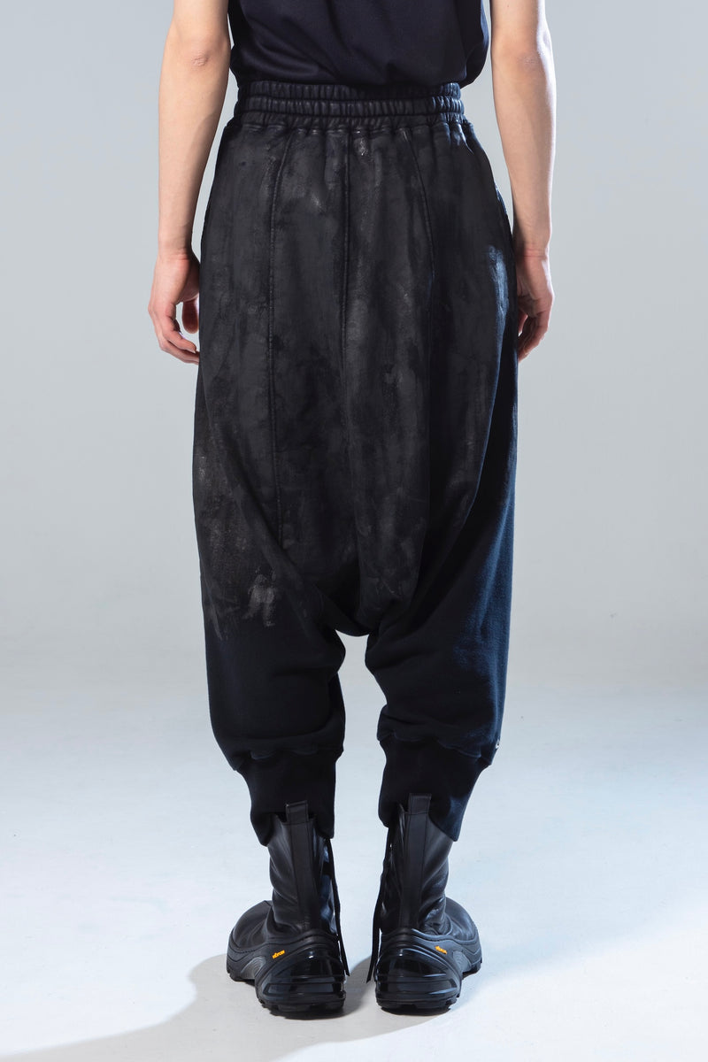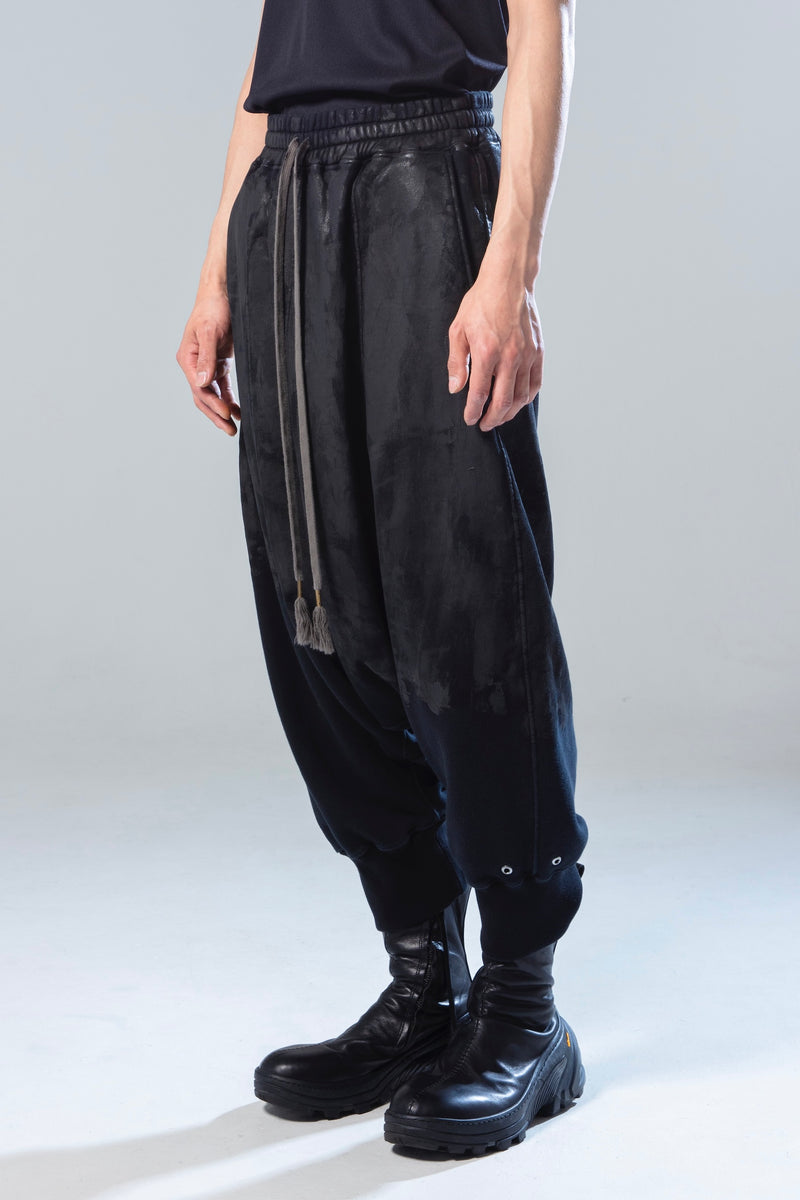 ドロップクロッチ、ワイドシルエットで構築したアンクルレングス、イージー仕様のパンツ。
